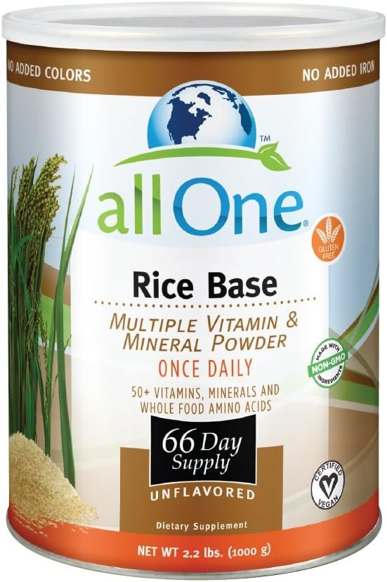 Since 1972, our goal at allOne has been the same: To make healthy living a whole lot easier. And what better way to achieve our vision than with our once daily Rice Base Multiple Vitamin & Mineral Powder! Beginning with a whole-food base of protein and bran, one serving of allOne’s Rice Base Multivitamin & Mineral Powder provides more than 50 vitamins, minerals, and naturally occurring amino acids with six grams of high-quality, dairy-free rice protein. Certified Vegan, this total-nutrition, once daily multivitamin powder can replace 15-20 pills a day! Additionally, this gluten and lactose-free, hypoallergenic, non-GMO formula is readily absorbed, easily digested, and contains absolutely no sweeteners, flavors, additives, or fillers. Rather, every molecule of allOne’s Rice Base Multiple Vitamin and Mineral Powder is pure nutrition. Simply add one heaping tablespoon of the unflavored powder to a glass of water, juice, or smoothie to create a complete, wholesome, and nutritional vitamin supplement. Now, that’s healthy living made easy!