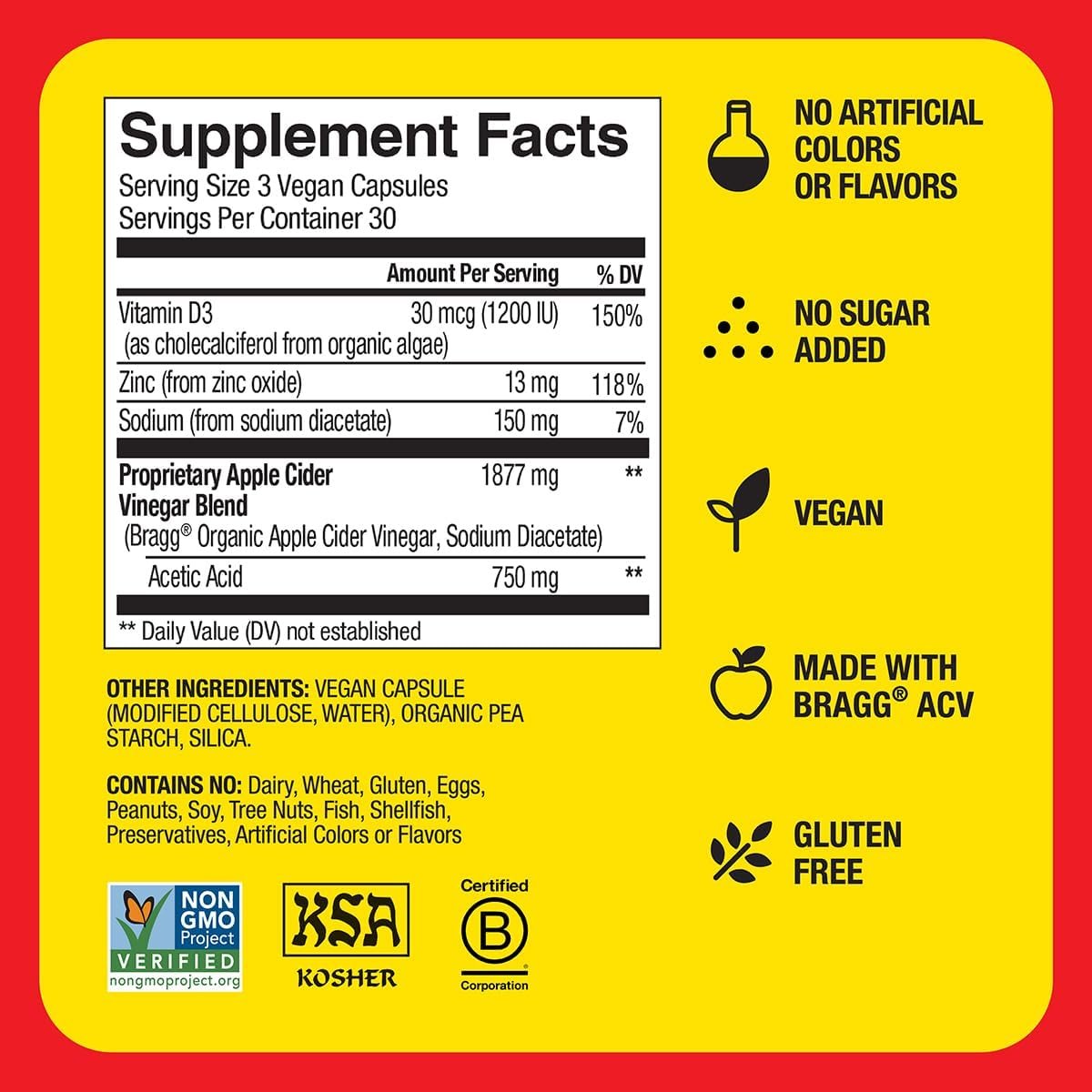 BRAGG ACV CAPSULES: Dietary supplement made with 1877mg of our proprietary ACV blend and 750mg of acetic acid per serving, plus vitamin D and zinc for immunity