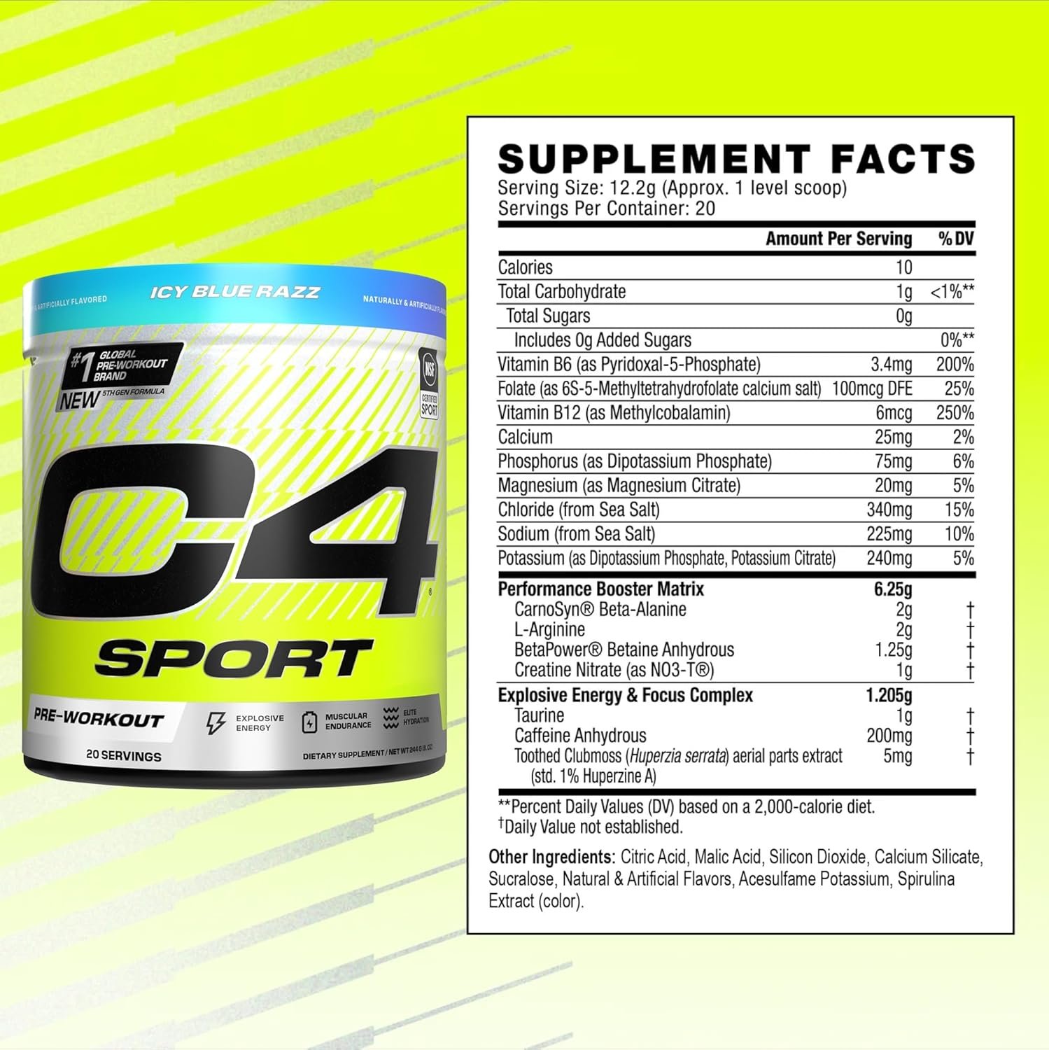Power up every training session with the upgraded C4 Sport pre-workout! Packed with extra active ingredients for hard-hitting energy, and fatigue-fighting muscular endurance, C4 Sport redefines high performance.* Every scoop delivers 200mg of hard-hitting caffeine for the explosive energy C4 is known for. Next, we combined 2g of CarnoSyn® Beta-Alanine, Creatine, Arginine, and BetaPower® Betaine to hit every rep with enhanced muscular endurance. Finally, the addition of critical electrolytes and key minerals are the fuel that power elite hydration. For hard-hitting training performance trusted by professional and collegiate athletes, fuel every workout with the new C4 Sport!
