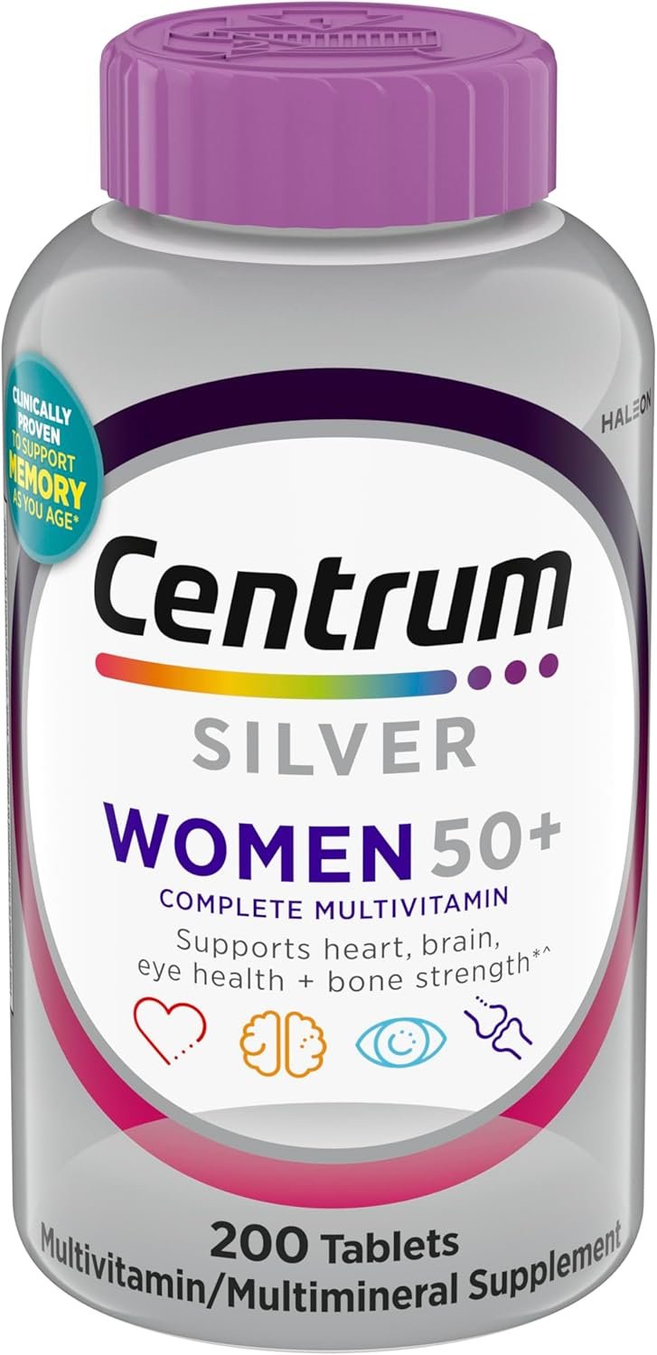One 200 count bottle of Centrum Silver Women’s Multivitamin for Women 50 Plus, Multivitamin/Multimineral Supplement with Vitamin D3, B Vitamins, Calcium and Antioxidant Vitamins C, E, and Beta-Carotene, and Zinc