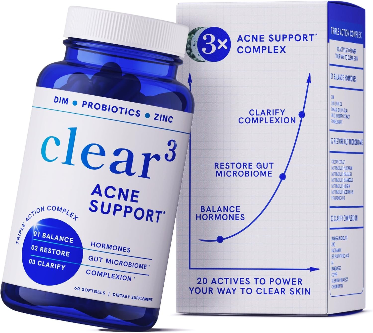 TRIPLE ACTION ACNE COMPLEX: Clear-3 is strategically formulated to tackle your acne problems by supporting the 3 factors that influence your skin the most: hormone balance, gut microbiome, and skin-essential nutrition.