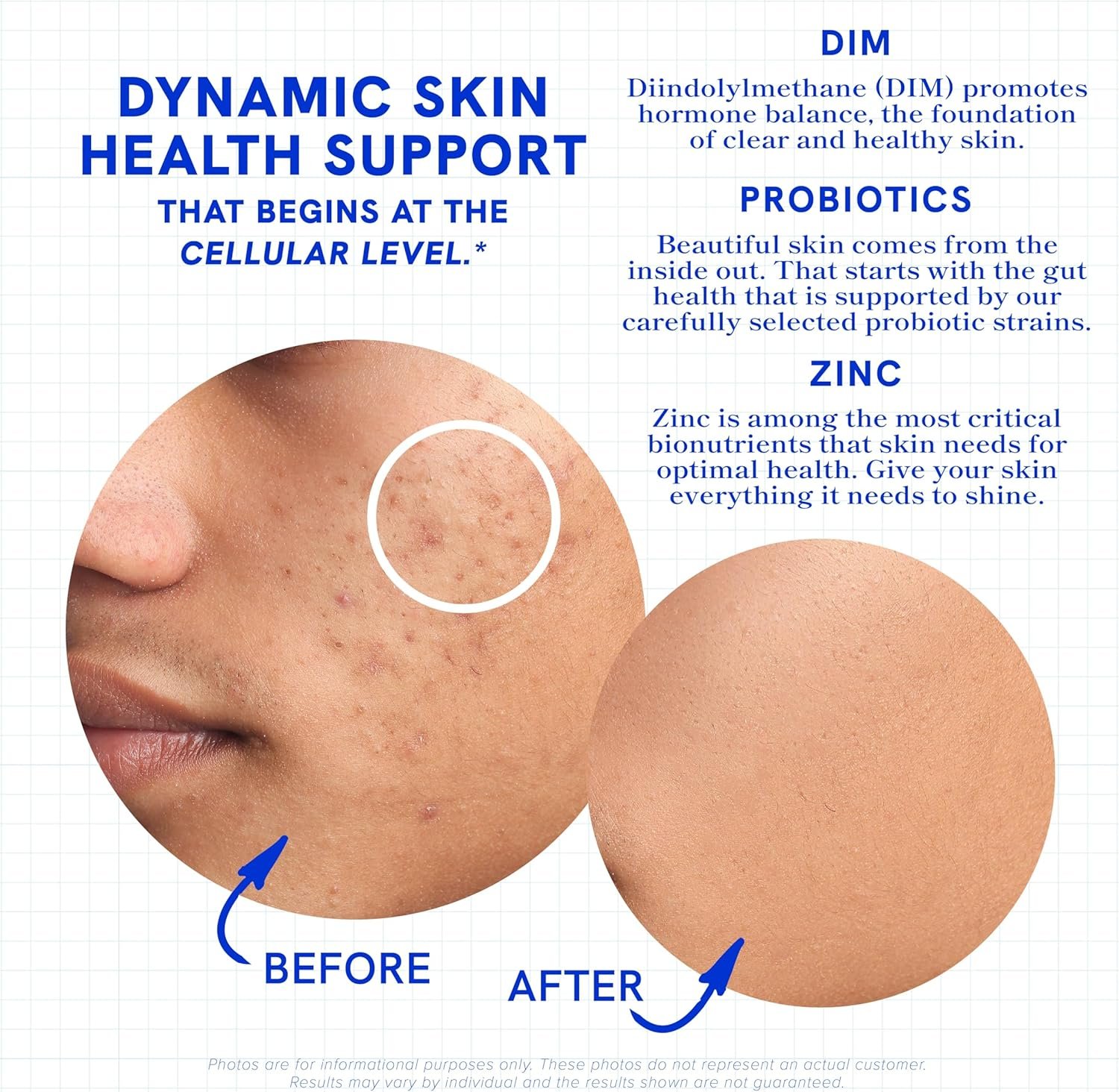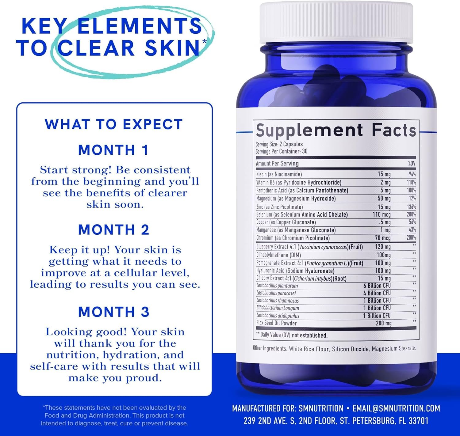 CLEAR SKIN VITAMINS: Zinc is crucial in our anti-acne supplement formula, along with other nutrients and vitamins for acne prone skin. Each serving supports hydration, collagen production, sebum control, and skin protection with Hyaluronic Acid, Niacinamide, Selenium, Vitamin B6, Borage Oil, and more.