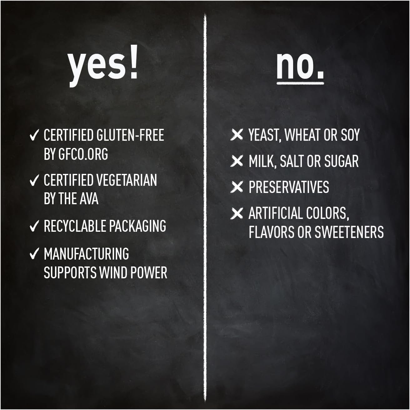 CONTAINS NO GMOs! Also NO – Yeast – Wheat – Soy – Milk – Salt – Sugar – Preservatives – Artificial Colors – Artificial Flavors – Artificial Sweeteners.