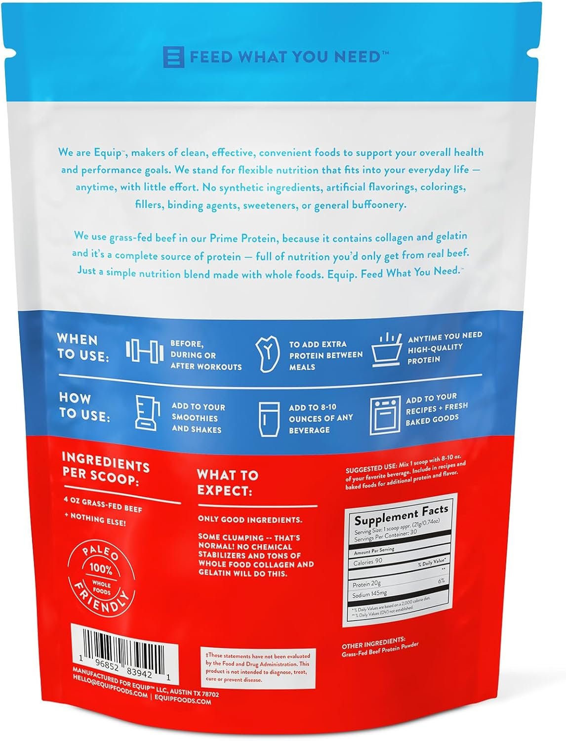 High Protein, Low Sugar: Prime unflavored protein powder delivers 21g+ of bioavailable complete protein made from grass fed beef protein powder, making it an excellent choice for your keto, paleo, carnivore, or protein-forward diet. Unlike many other protein isolate powders, it contains no added sugar, soy, dairy, gluten, egg, or whey. Equip’s clean formula supports bloat-free nutrition and delivers the same amount of protein as a 4oz serving of steak.