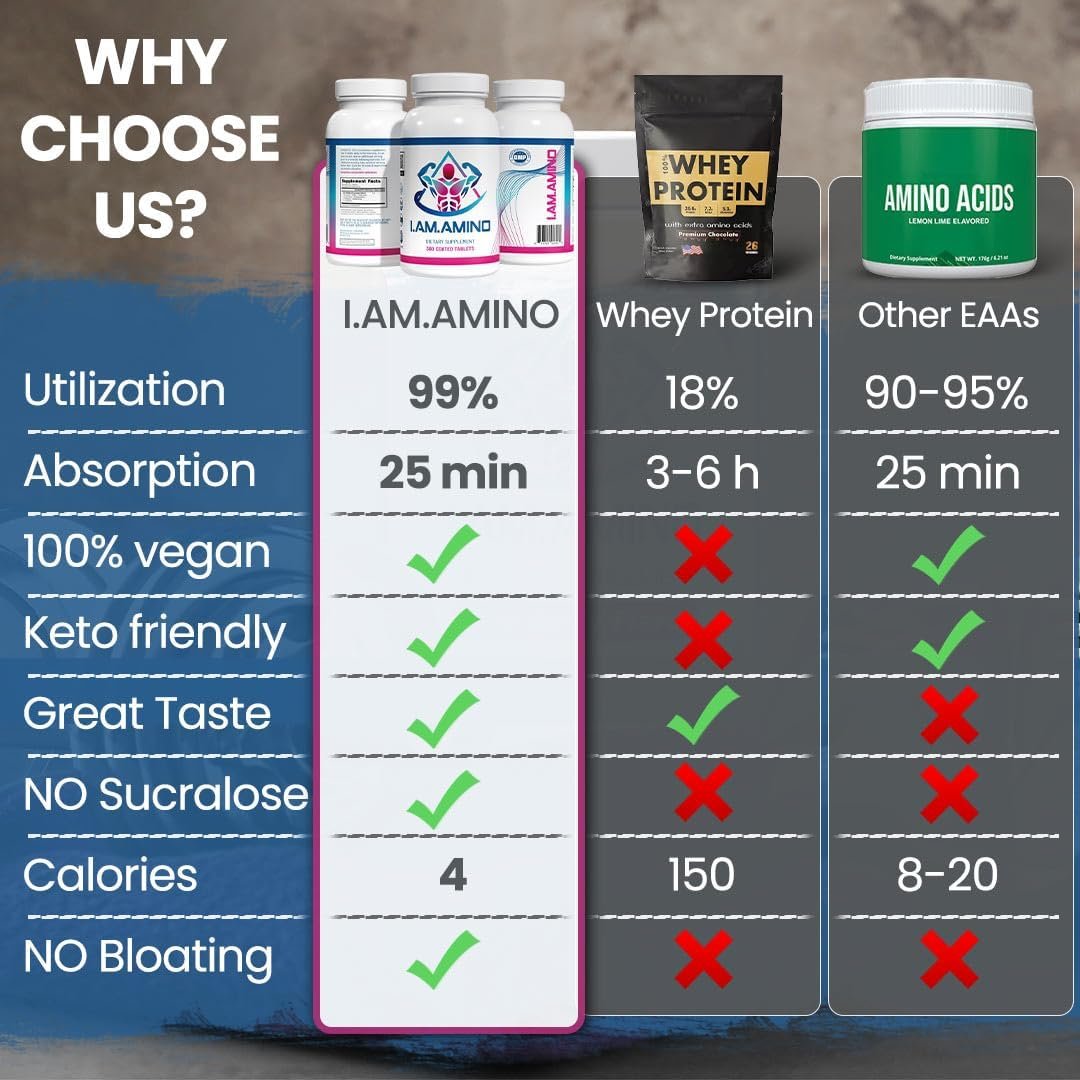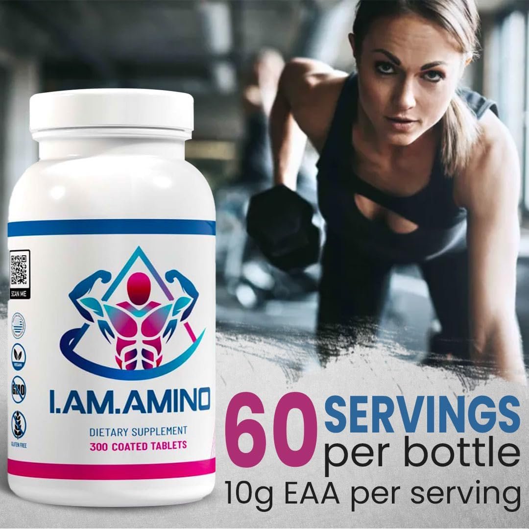 The Perfect Amino Acids Tablets: Experience the convenience of I.AM.AMINO coated tablets, meticulously designed for easy ingestion and optimal absorption. Small and easy to swallow, these eaas tablets can be easily integrated into your life, while traveling, so you can get your daily amino acid supplement anytime, anywhere—supporting muscle growth, stamina, and promoting weight loss.