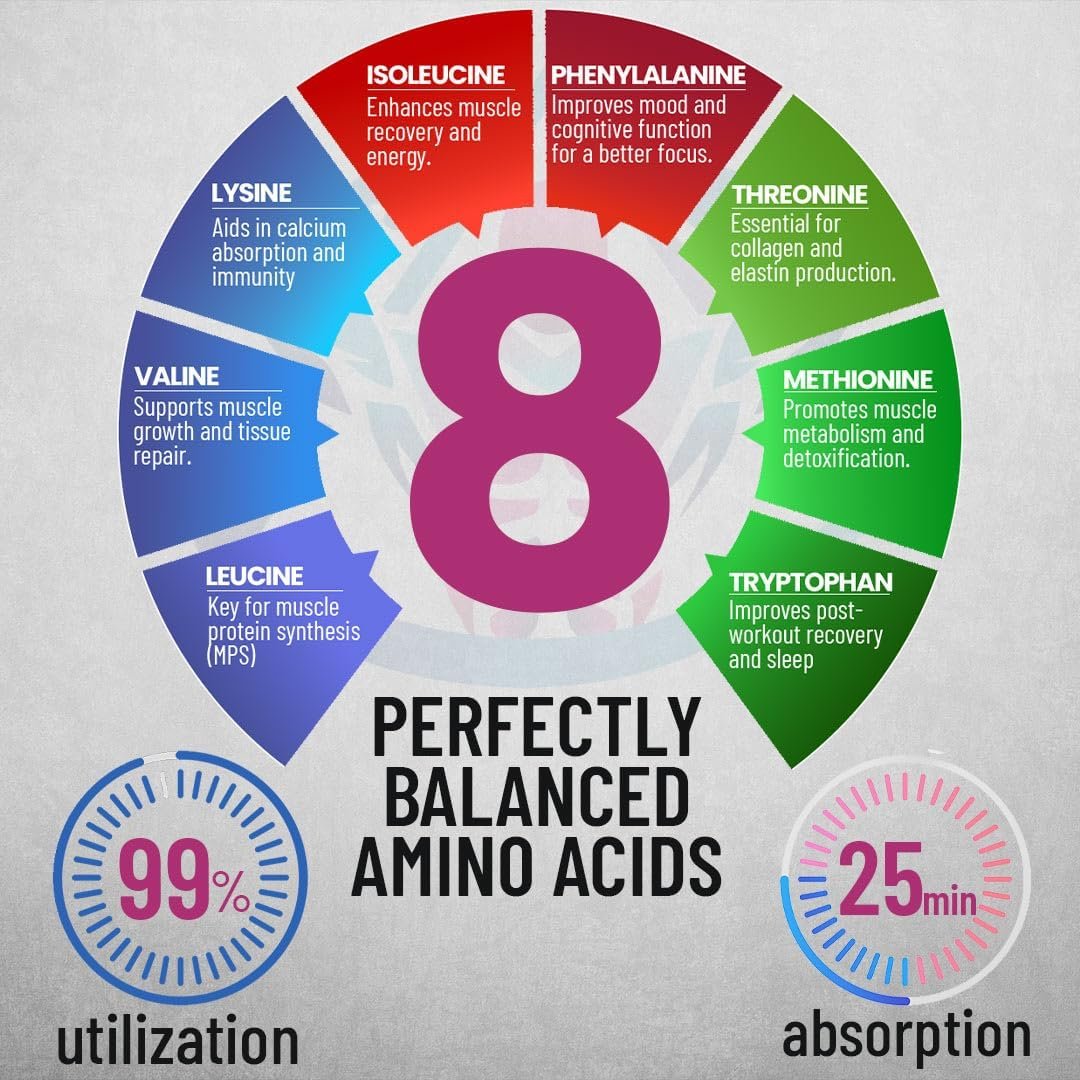 Essential Amino Acids for Muscle Growth: Boost your workout results with our full spectrum of 8 essential amino acids, designed to support muscle recovery, strength, and endurance. Perfect for men and women looking to enhance performance.
