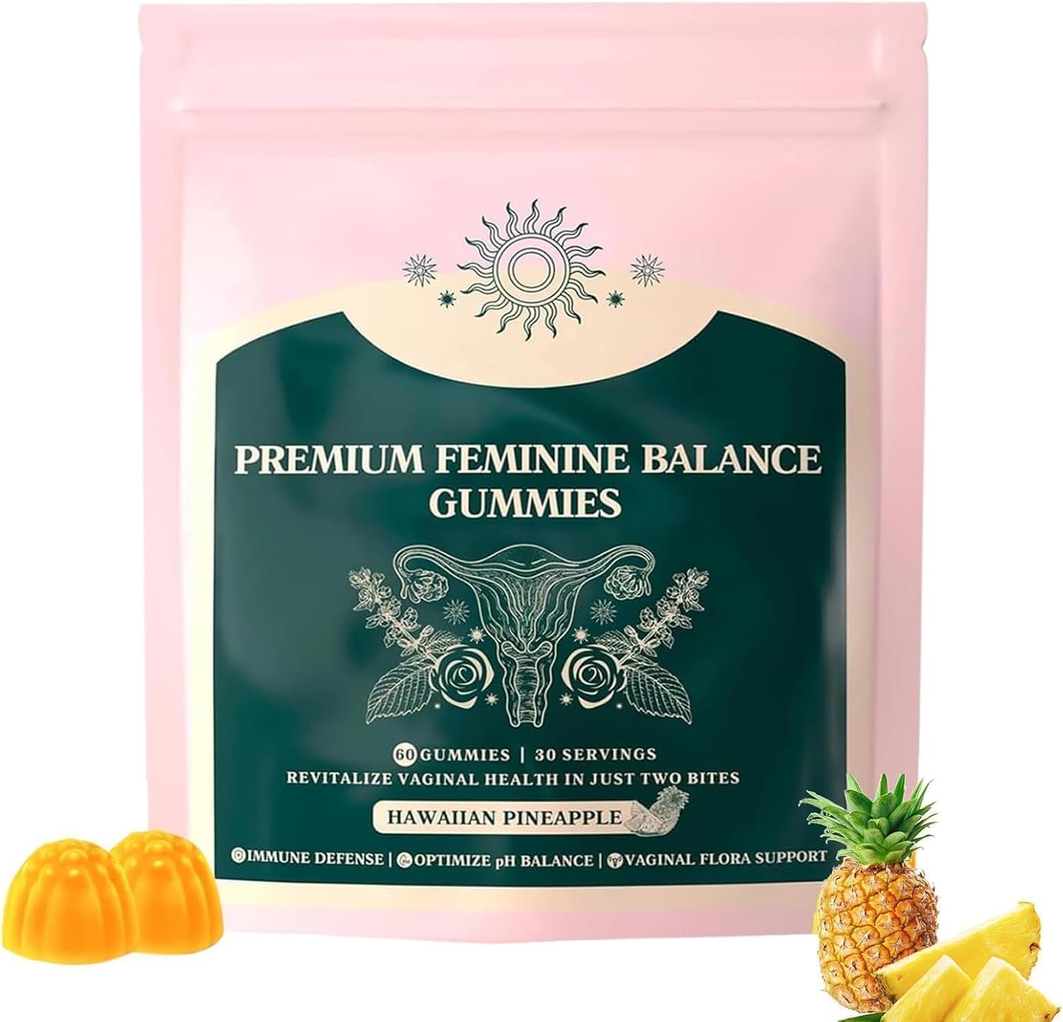 Enjoy the benefits of traditional feminine care in a delicious and convenient form.The production of these gummy candies helps maintain pH balance,enhance immunity,keep the digestive system in good condition,and at the same time offer a refreshing Hawaiian pineapple flavor.