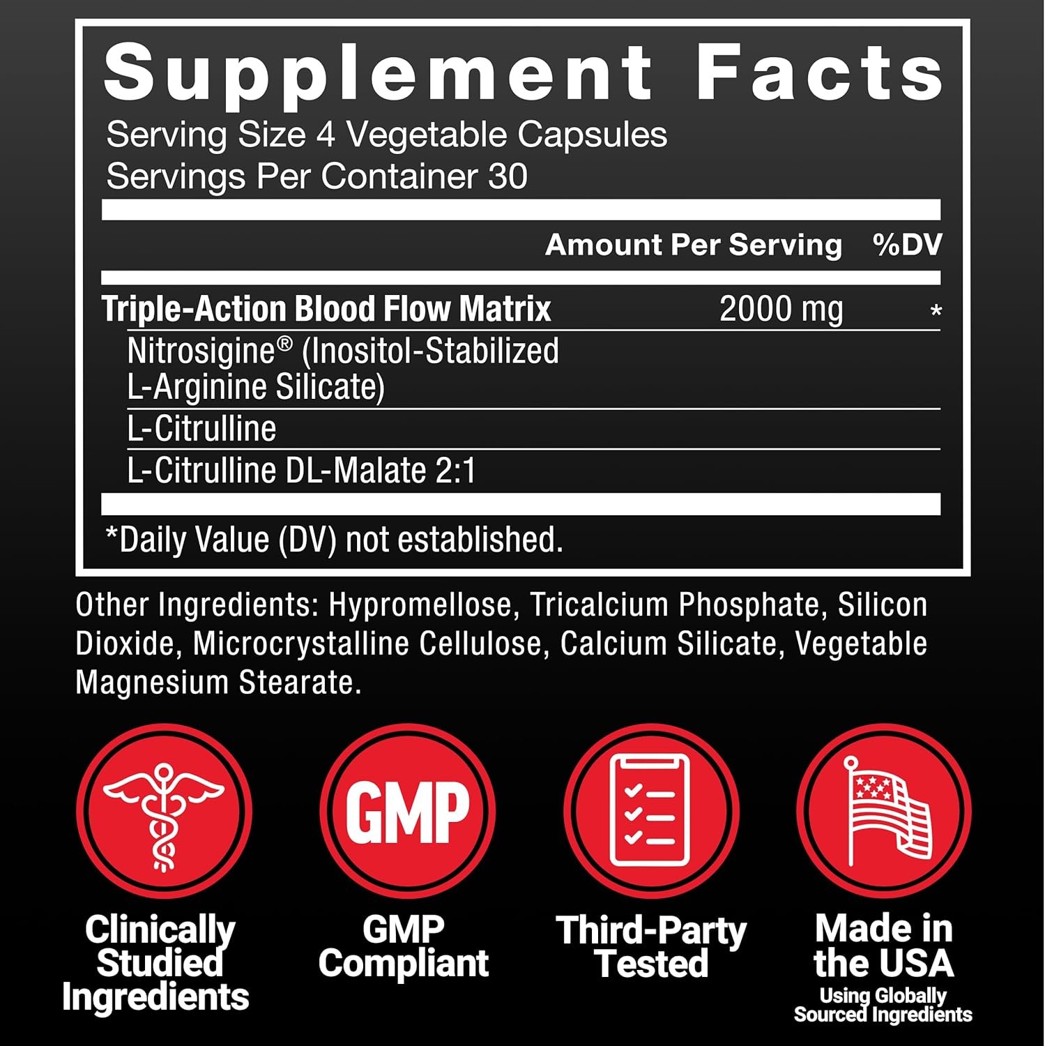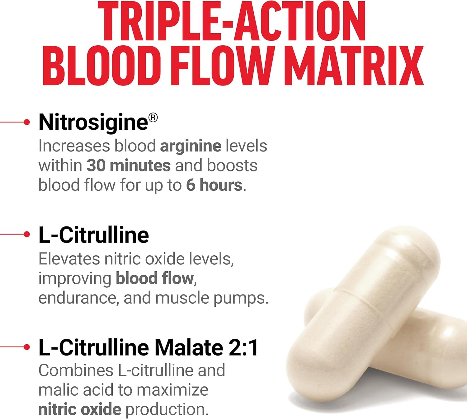 BOOST NITRIC OXIDE WITH TRIPLE-ACTION BLOOD FLOW MATRIX: Nitric Oxide Booster contains the Triple-Action Blood Flow Matrix of Nitrosigine L-arginine, L-citrulline, and L-citrulline malate to support blood flow, vasodilation, and sleeve-splitting muscle pumps.