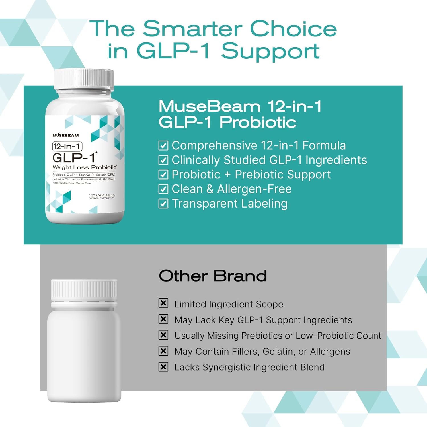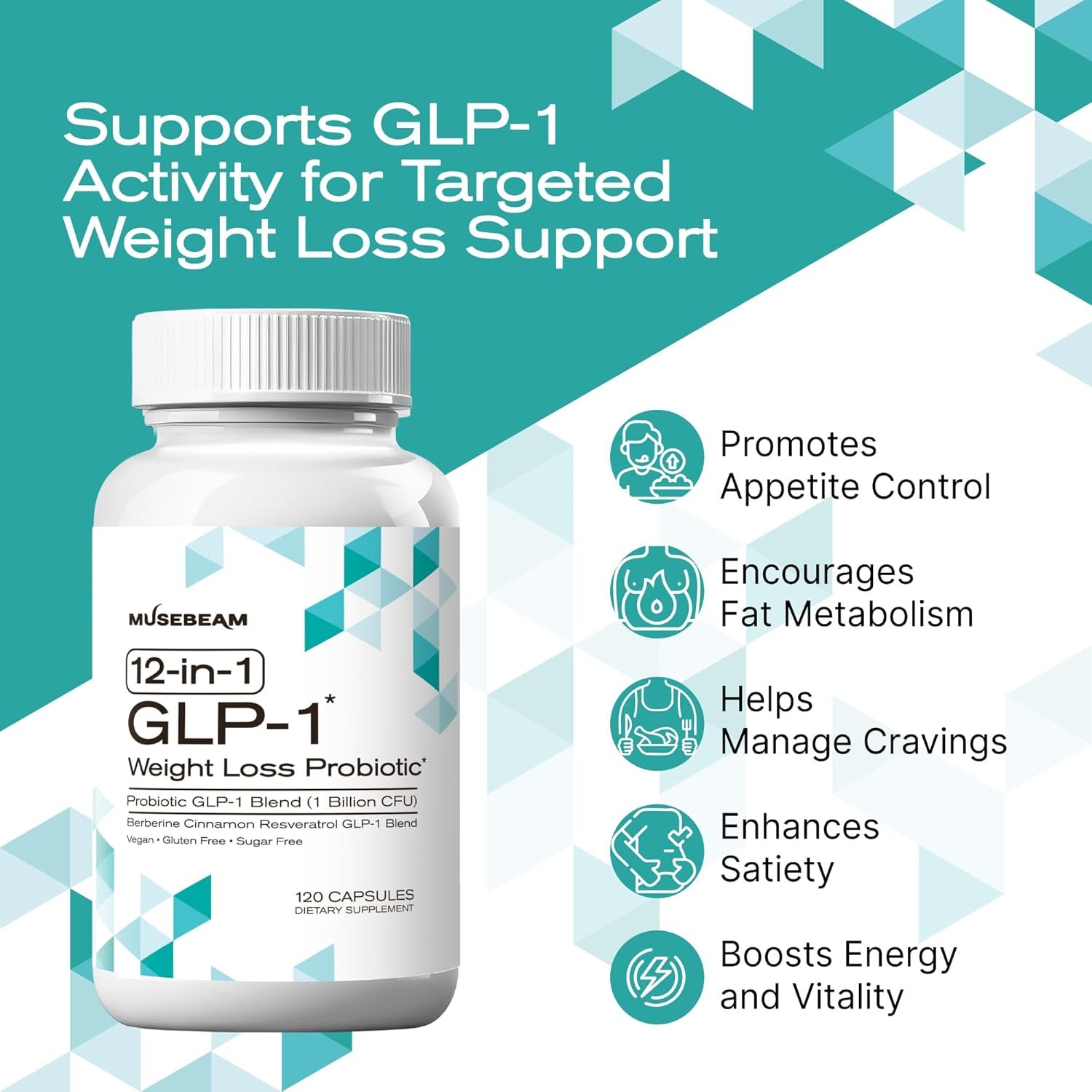 12-in-1 Weight Management Formula: MuseBeam 12-in-1 GLP-1 Weight Loss Probiotic Capsules deliver a robust 1500 mg blend including Berberine, Cinnamon, Turmeric, Resveratrol, Garcinia, Raspberry Ketone, and more to support healthy GLP-1 activity, fat metabolism and appetite regulation. This carefully crafted formula complements active lifestyles by promoting balanced eating patterns, supporting natural weight goals, and encouraging gut and metabolic health.