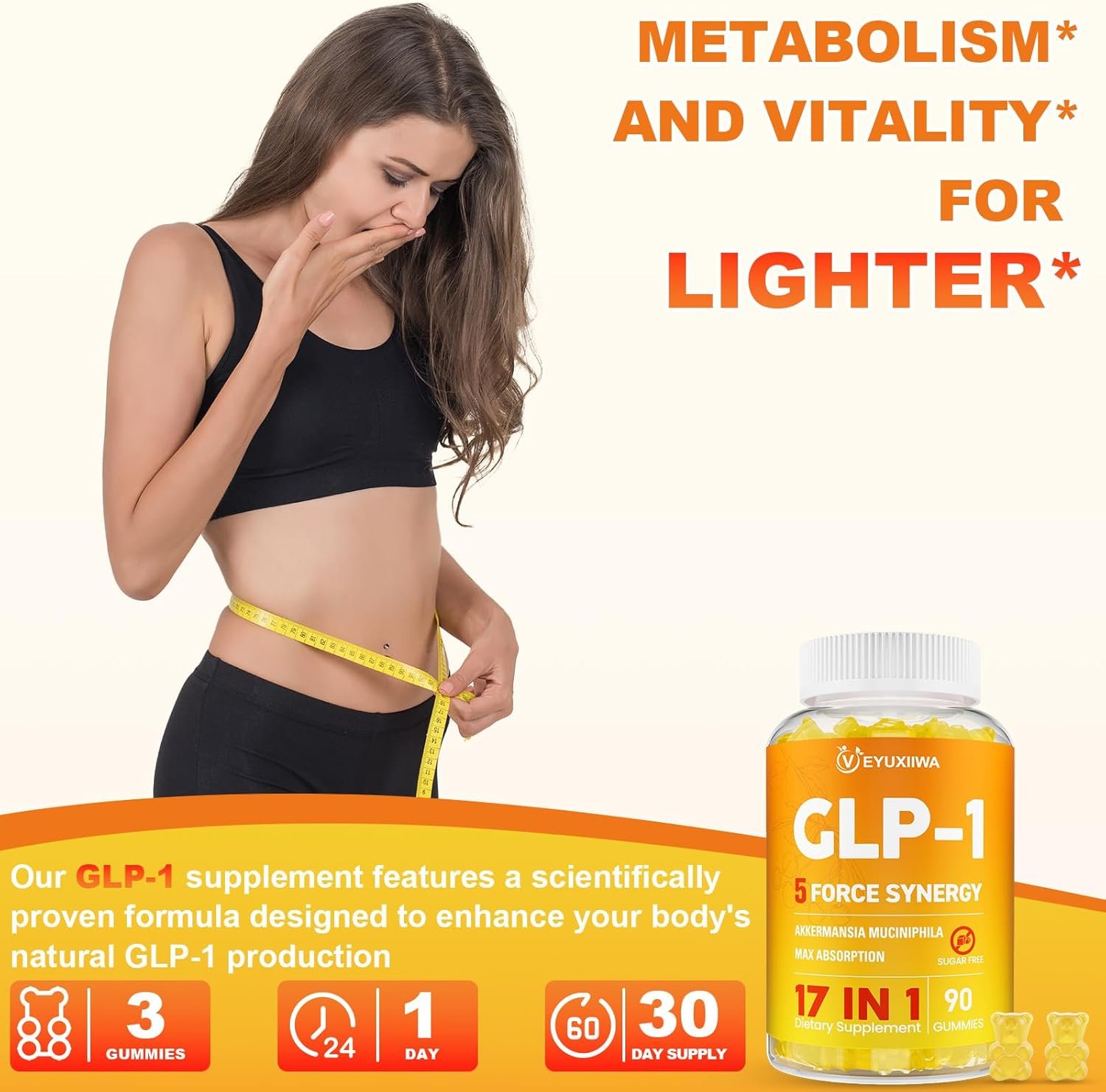 ENJOY A HEALTHIER LIFESTYLE: Our GLP-1 supplement gummies feature a sugar-free, naturally refreshing yuzu flavor. they’re the perfect choice for those on a low-calorie diet or workout plan, offering a tasty way to stay on track without sacrificing quality or effectiveness. with our GLP-1 gummies, you can support your diet goals and enhance your routine while keeping your calorie intake in check