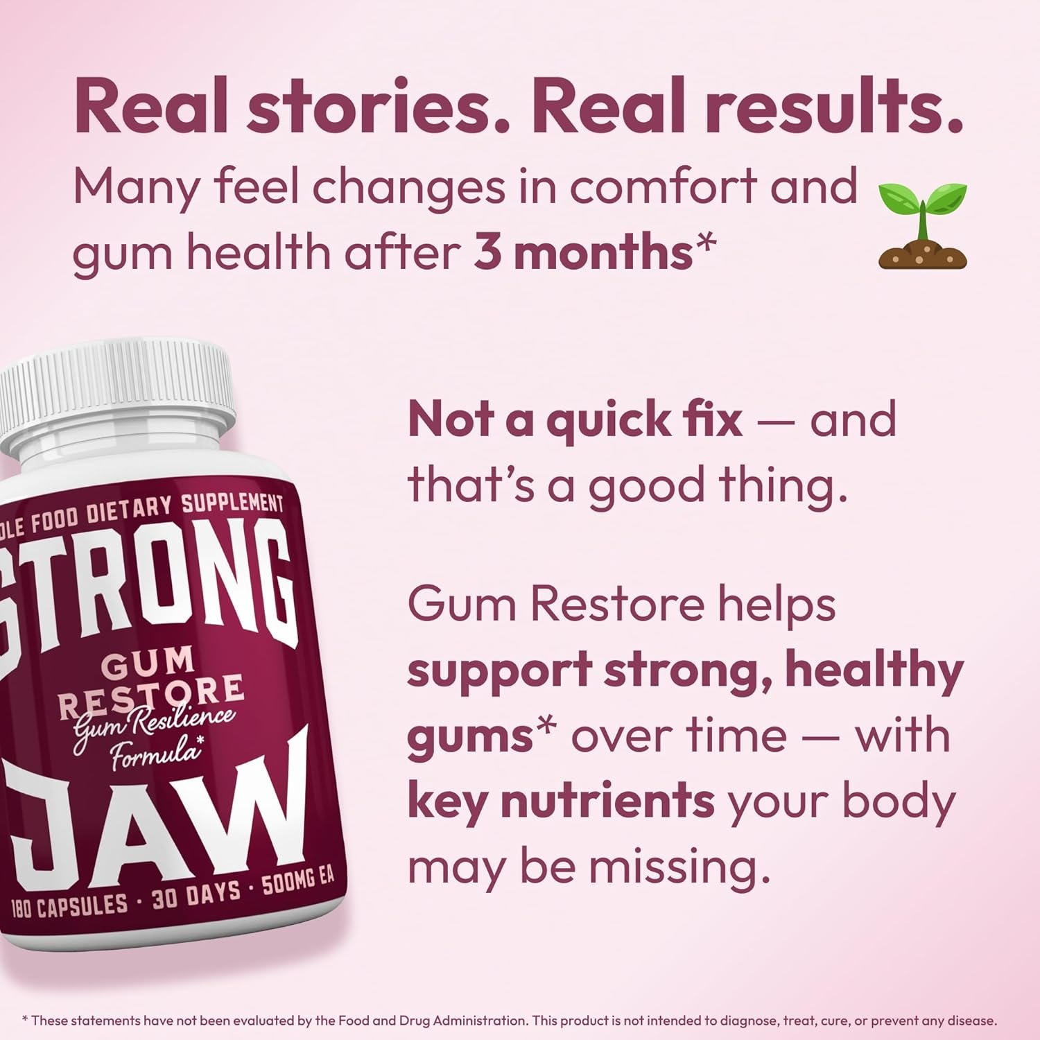 EVERYDAY GUM & TEETH SUPPORT – Add Strong Jaw Gum Restore to your daily routine to support gum care and teeth health. This formula supports efforts to strengthen gums and maintain overall oral care with carefully selected dental vitamins and teeth supplements. A great addition for anyone focused on gum health, good gums, and lasting oral health.