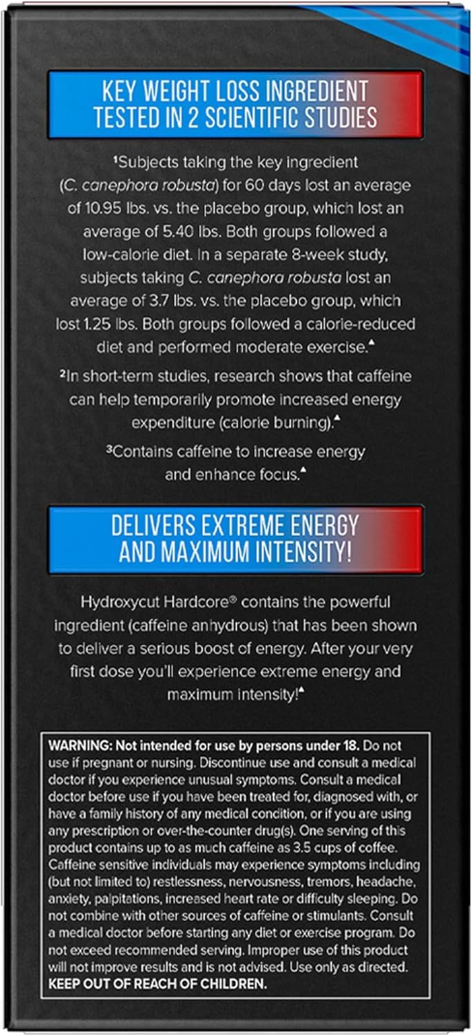 EXTREME ENERGY + FOCUS – With 265 mg of caffeine anhydrous and 200 mg of green coffee extract, Hydroxycut Hardcore gives you the boost you need to increase energy expenditure and help you burn more calories.