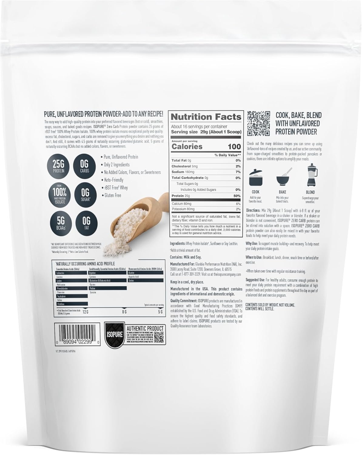 Add less and do more with Isopure Zero Carb 100% Pure Whey Protein Isolate Protein Powder — an immune-supporting Isopure protein powder designed to be gluten free, lactose free, and all-around good for you. As a premium source of high-protein content, minerals and 20 vitamins, including vitamin C, this Isopure unflavored protein powder helps support daily health and overall wellness. Just mix one 29-gram scoop of 100% pure whey protein isolate with 6-8 fl oz of your favorite beverage in a blender or shaker. Amp up hummus with a scoop of this unflavored protein for every can of chickpea, or give yourself a morning boost by making protein egg muffins. Cook, bake or blend with this unflavored protein powder before or after exercise, or anytime you want a protein boost. Each serving delivers 5 grams of naturally occurring BCAAs, and an added vitamin and mineral blend to help you meet your micronutrient needs — perfect for daily use in a smoothie, protein shake, or baked goods like a protein muffin or protein cookie. From exploring new recipes with your family to solitary hikes on the trails, Isopure goes where you go. Add Less. Do More.