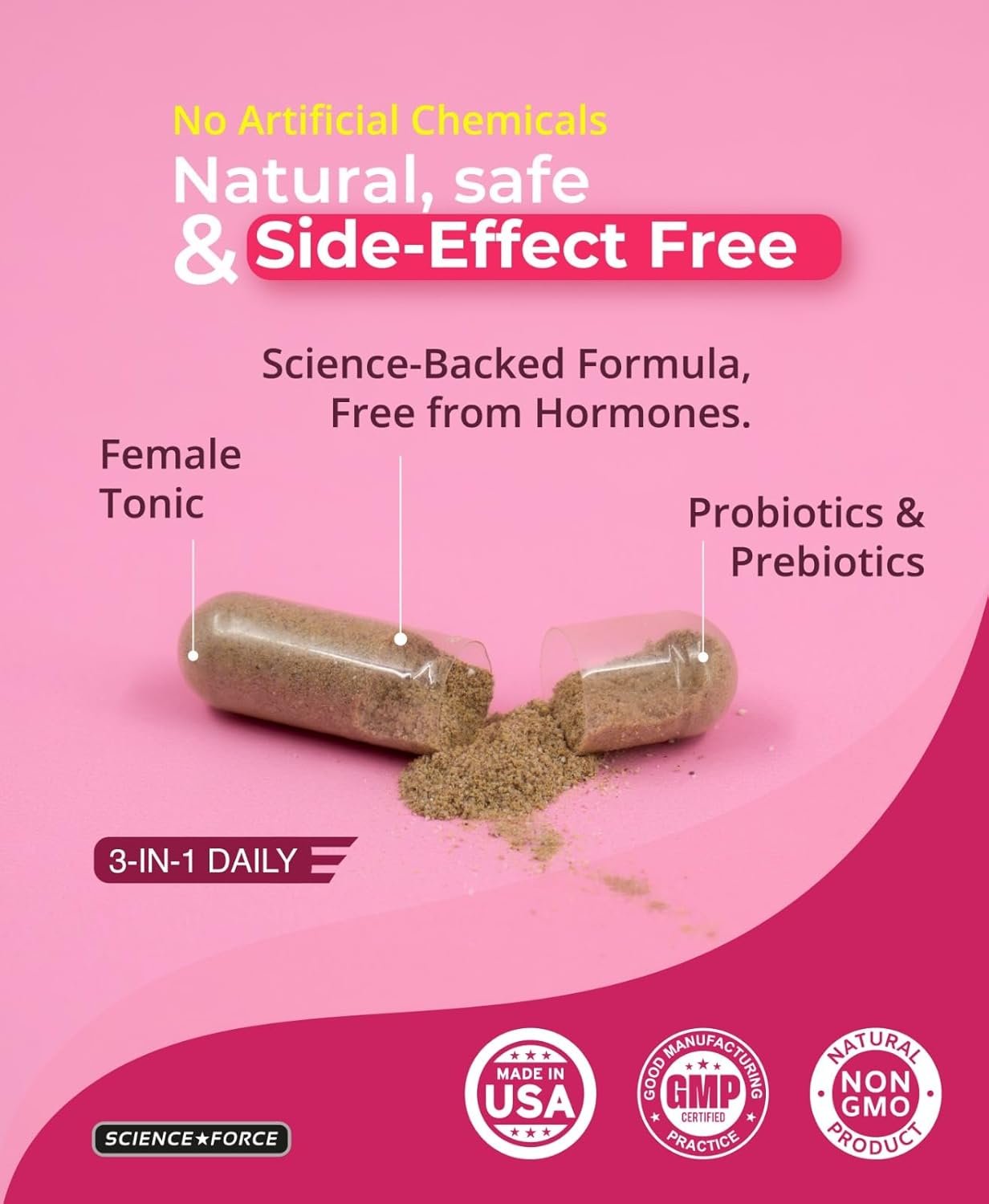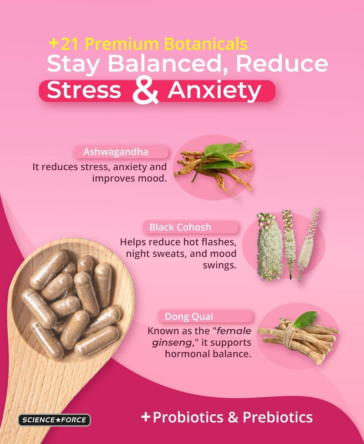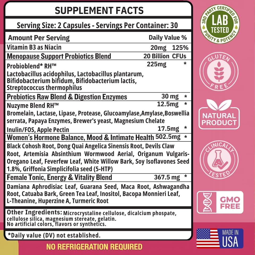 【 21 PREMIUM INGREDIENTS 】: Black Cohosh, Dong Quai, Devils Claw, Artemisia, Oregano, Feverfew, White Willow, Soy Isoflavones, Griffonia 5-HTP + Damiana Aphrodisiac, Guarana, Maca Root, Ashwagandha, Catuaba Bark, Green Tea Leaf, Inositol, Bacopa Monnieri, L-Theanine, Huperzine-A, Turmeric + 5 Strains of Probiotics & Prebiotics.