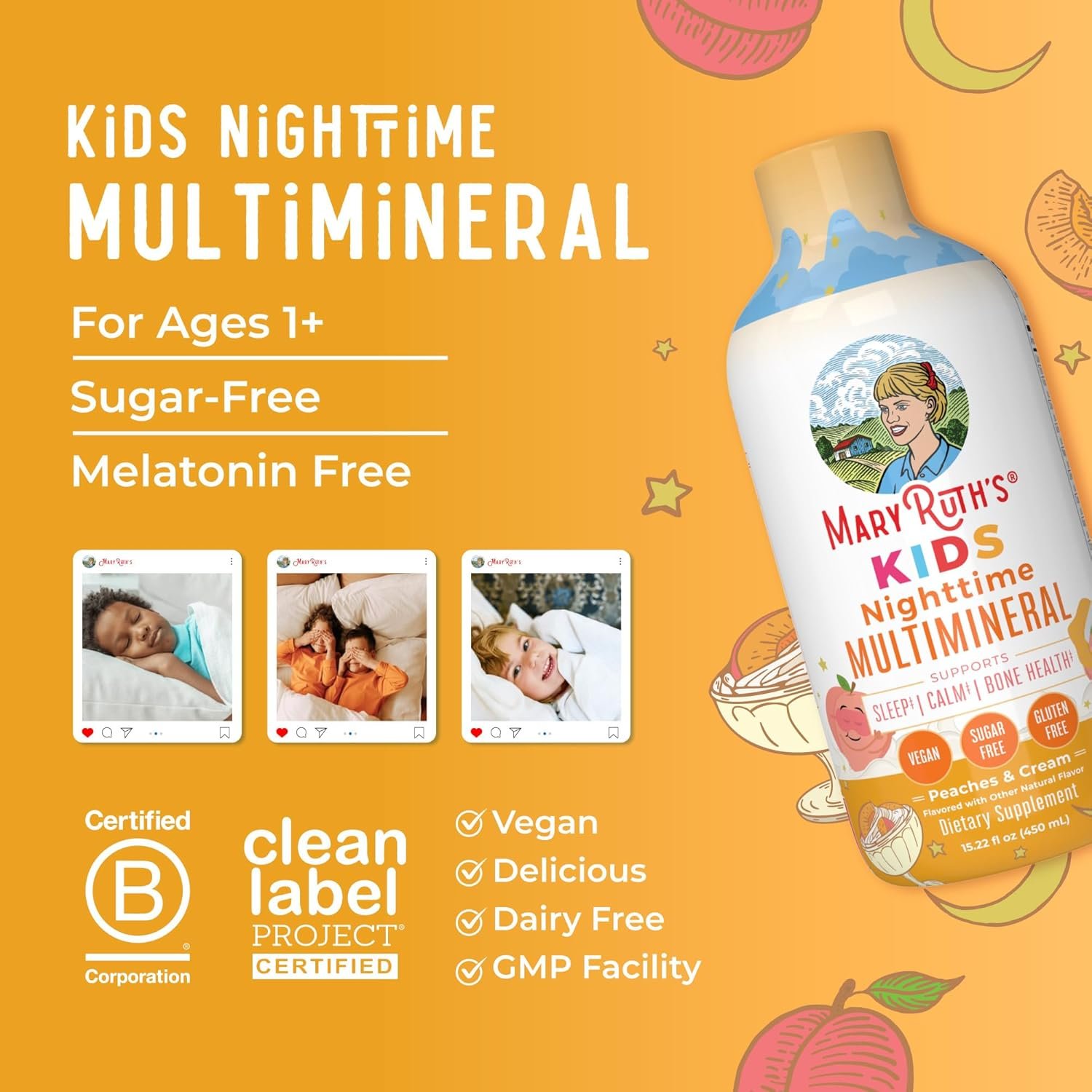 For Most Lifestyles: MaryRuth’s Kids Nighttime Multimineral is Non-GMO, Vegan, Made in a GMP Facility. Dairy Free, Nut Free, Gluten Free, Sugar Free. Formulated For Kids! Clean Label Project Certified. B Corp Certified.