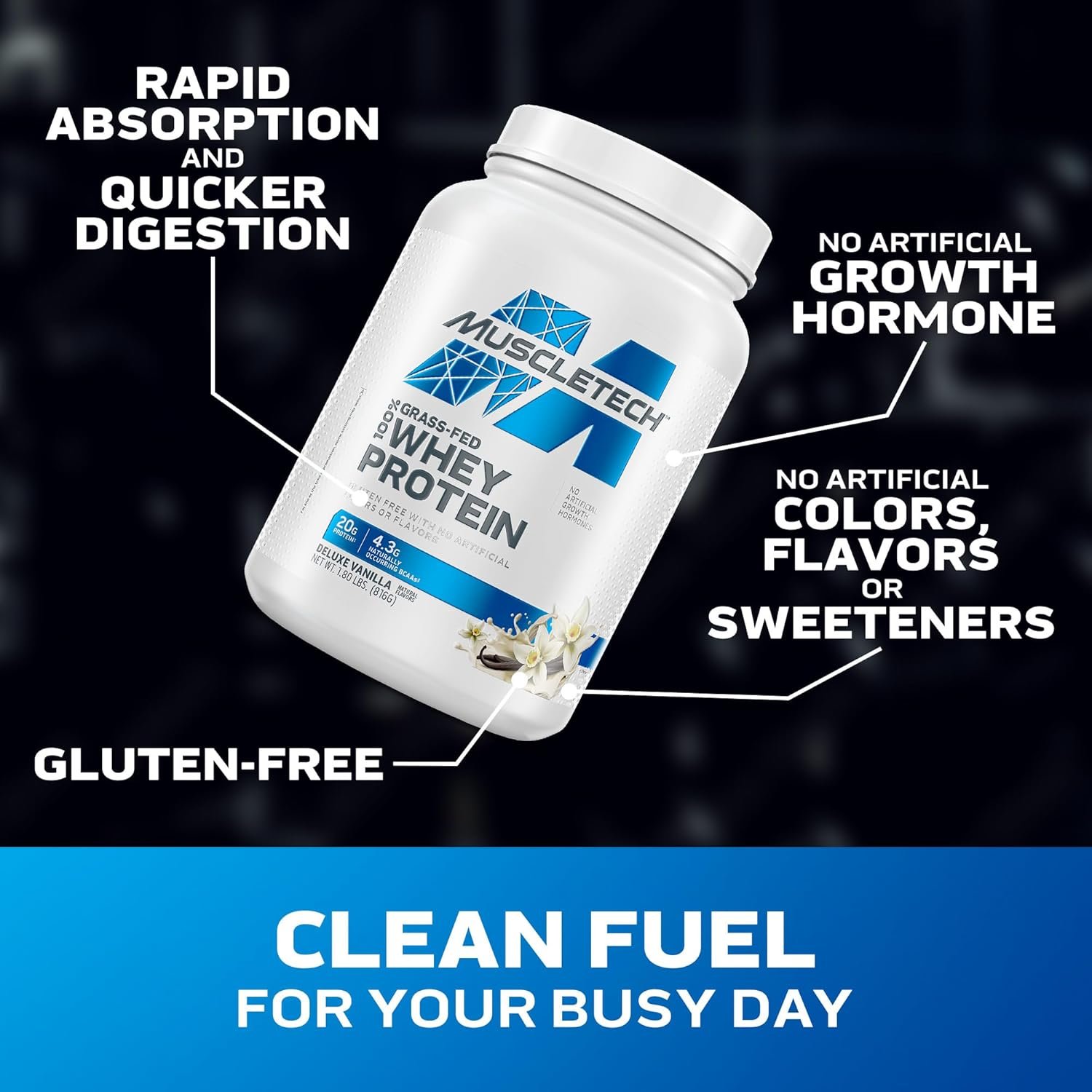 Grass-Fed Gains: MuscleTech Grass-Fed Whey Protein Powder is the right choice for a clean and fast-digesting whey protein source for fitness enthusiasts of every level and supports muscle building. Deluxe Vanilla. Approximately 23 scoops per tub.