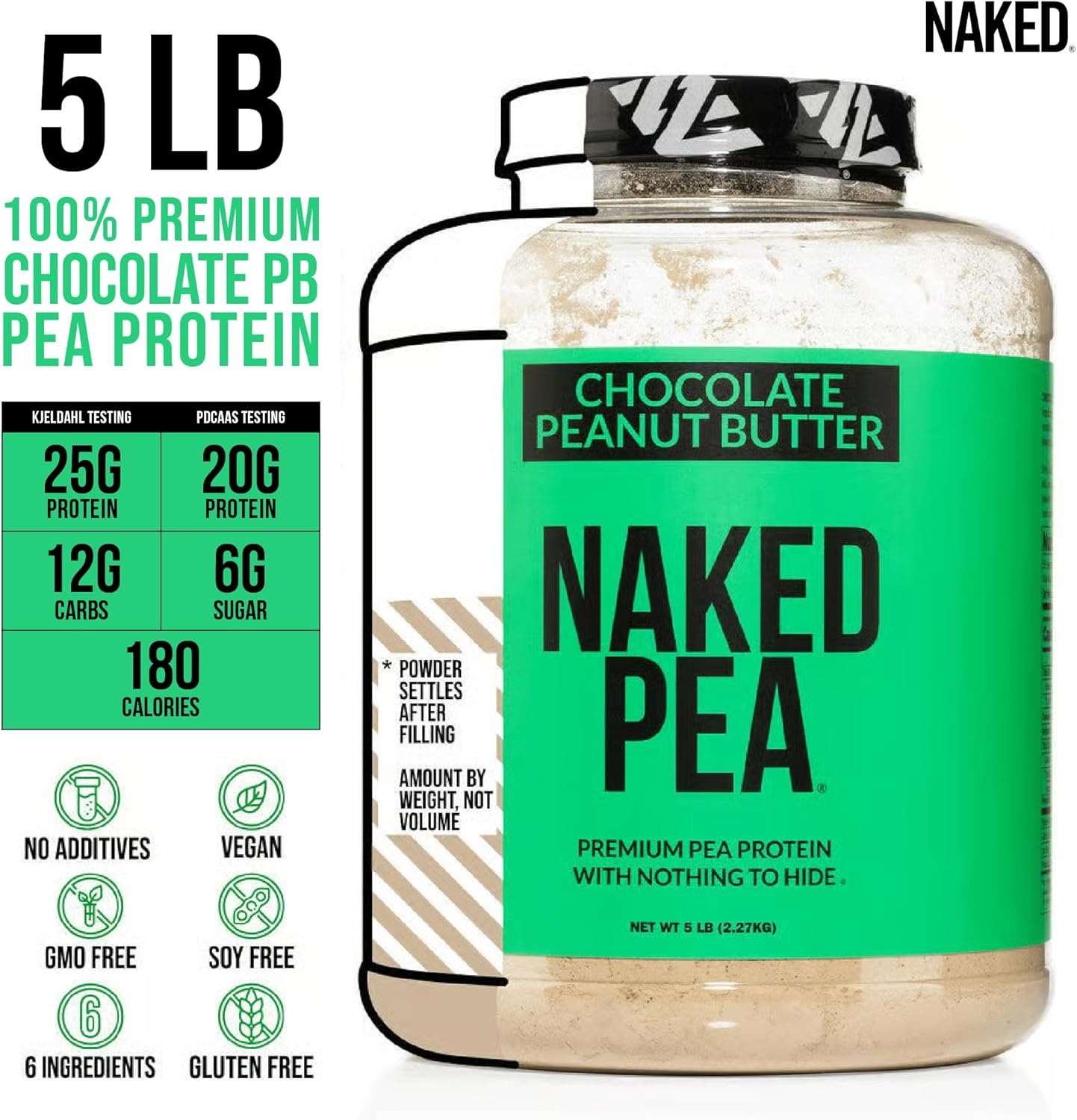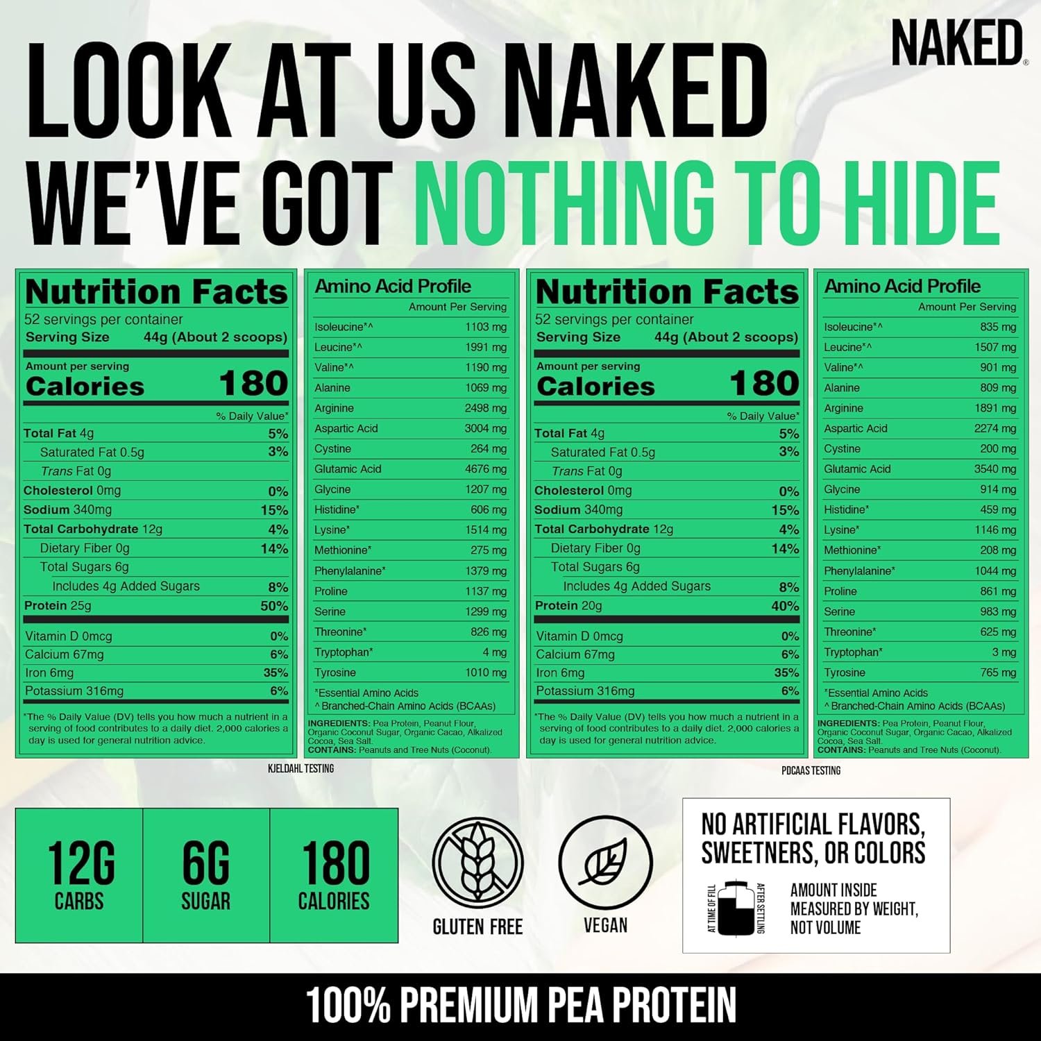 NAKED MEANS NOTHING ARTIFICIAL: Pea Protein from US and Canadian Farms, Peanut Flour from US farms, Organic Coconut Sugar, Organic Cacao, Alkalized Cocoa, and Sea Salt. That’s it. Naked Pea contains no artificial sweeteners, artificial flavors, or colors and is GMO-Free, Soy Free and Gluten-Free.