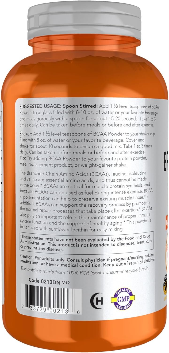 The Branched Chain Amino Acids (BCAAs) leucine, isoleucine and valine are essential amino acids and thus cannot be made in the body.* BCAAs are critical for muscle protein synthesis, and because BCAAs can be used as fuel during exercise, BCAA supplementation can help to preserve existing muscle tissue.* In addition, BCAAs can support the recovery process by promoting the normal repair processes that take place after exertion.* BCAAs also play an important role in the maintenance of proper immune system function and the support of healthy aging.* Natural color variation may occur in this product. Spoon Stirred: Add 2 level teaspoons of BCAA Powder to a glass filled with 8 – 10 oz. of water or your favorite beverage and mix vigorously with a spoon for about 15 – 20 seconds. Take 1 to 3 times daily. Can be taken before meals or before and after exercise. Shaker: Add 2 level teaspoons of BCAA Powder to your shaker cup filled with 8 – 10 oz. of water or your favorite beverage. Cover and shake for about 10 seconds to ensure a good mix. Take 1 to 3 times daily. Can be taken before meals or before and after exercise. Tip: Try adding BCAA Powder to your favorite protein powder, meal replacement product, or weight-gainer shake.