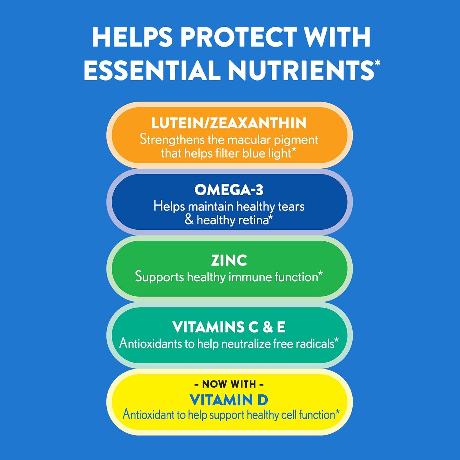 OCUVITE EYE VITAMINS: Ocuvite eye vitamins focus on supporting your eye health and replenishing essential eye nutrients as you age.