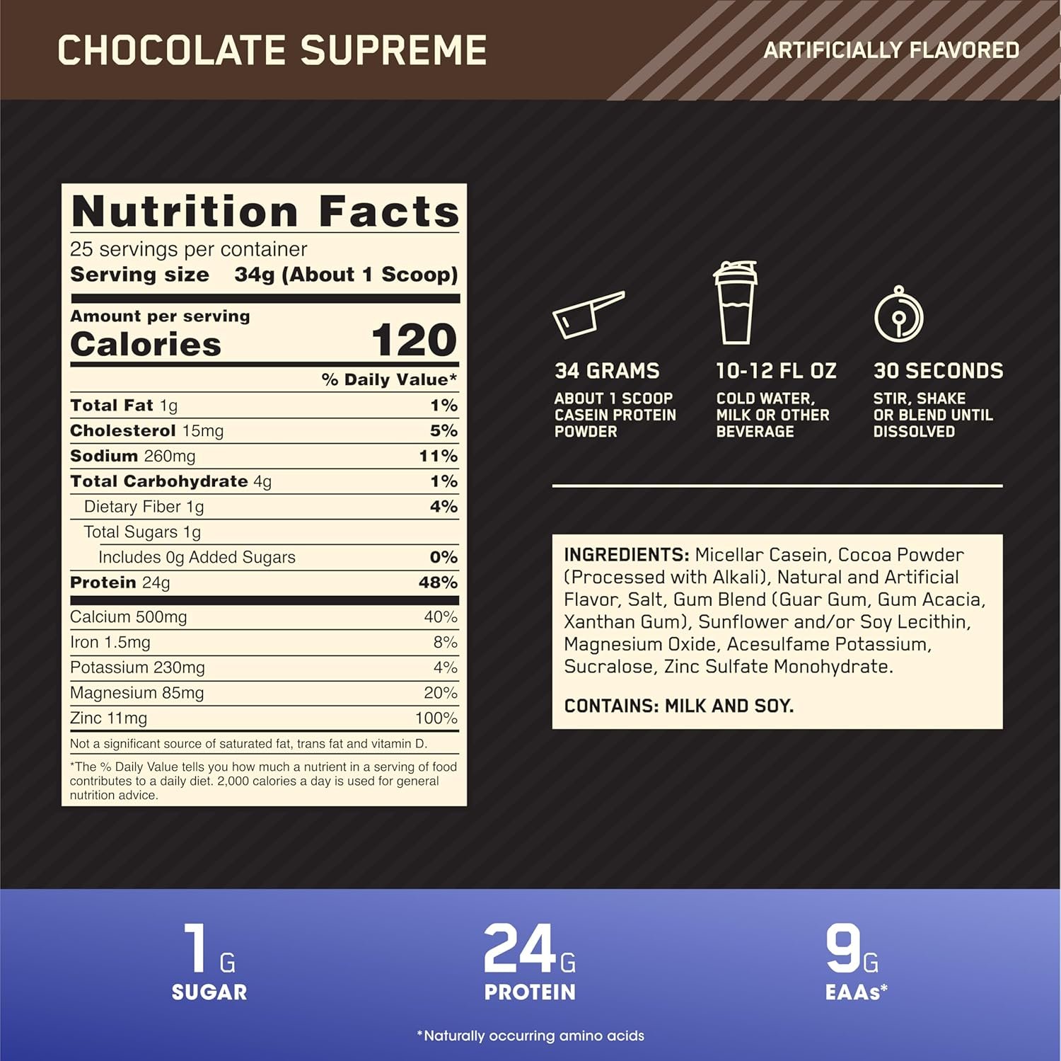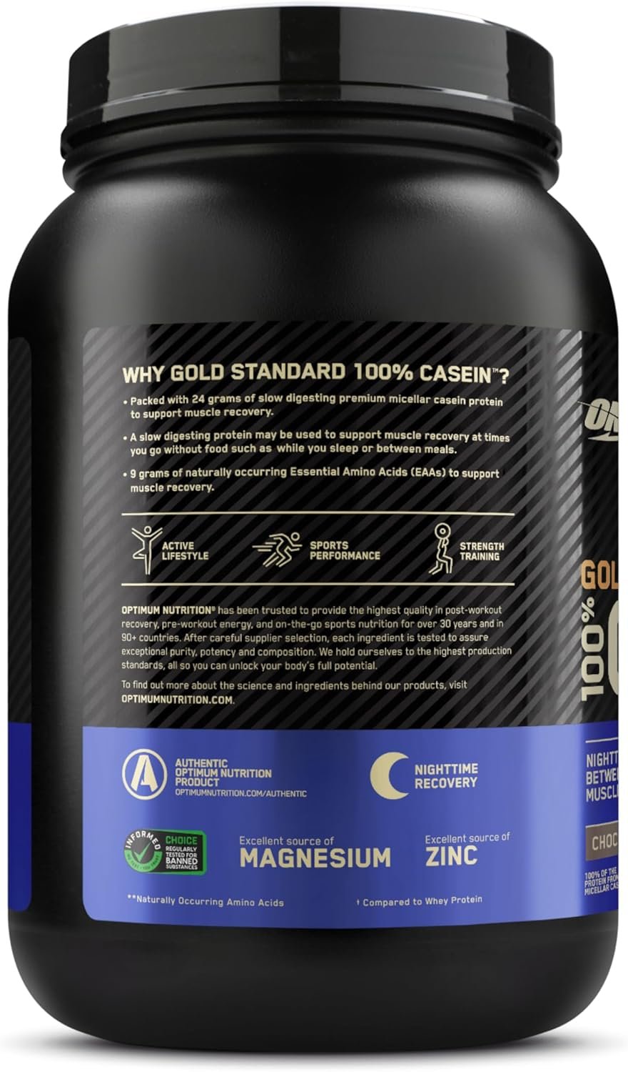 Optimum Nutrition Gold Standard 100% Micellar Casein Protein Powder helps support muscle recovery. Made with micellar casein, this protein shake powder ensures that you’re getting high quality protein with every serving. With nearly 9 grams of naturally occurring Essential Amino Acids per serving, this protein powder drink supports recovery, making it ideal for use between meals and before bedtime. Each serving of this delicious Cookies and Cream-flavored powder is an excellent source of zinc, magnesium and calcium and provides 24 grams of protein. Optimum Nutrition powder mixes easily using a shaker cup or blended in a smoothie. There are 25 servings in this 1.81 pound container. Gold Standard 100% Casein from Optimum Nutrition, the World’s #1 Sports Nutrition Brand.* *Source Euromonitor International Limited; Consumer Health 2023 Edition, Sports Nutrition category, %retail value shares, 2022 data.