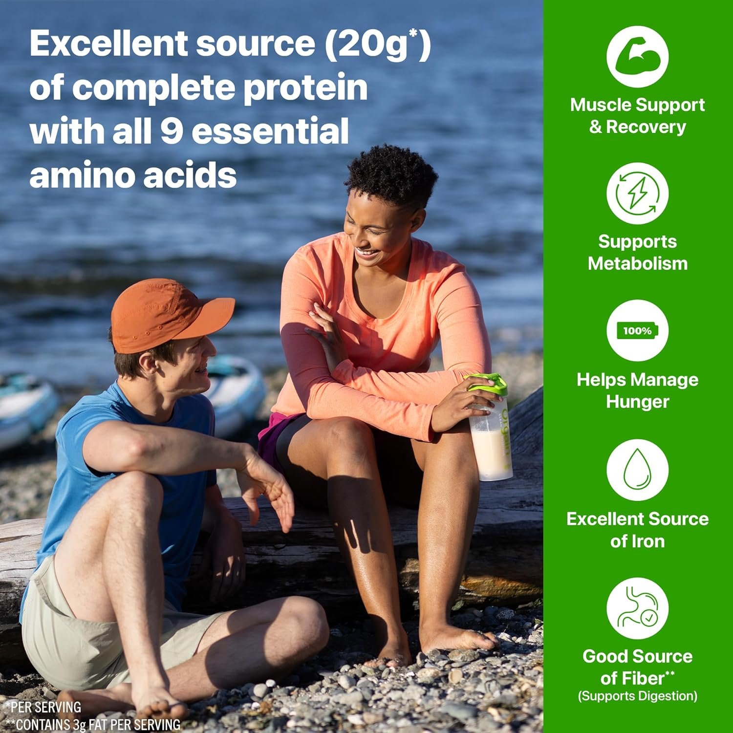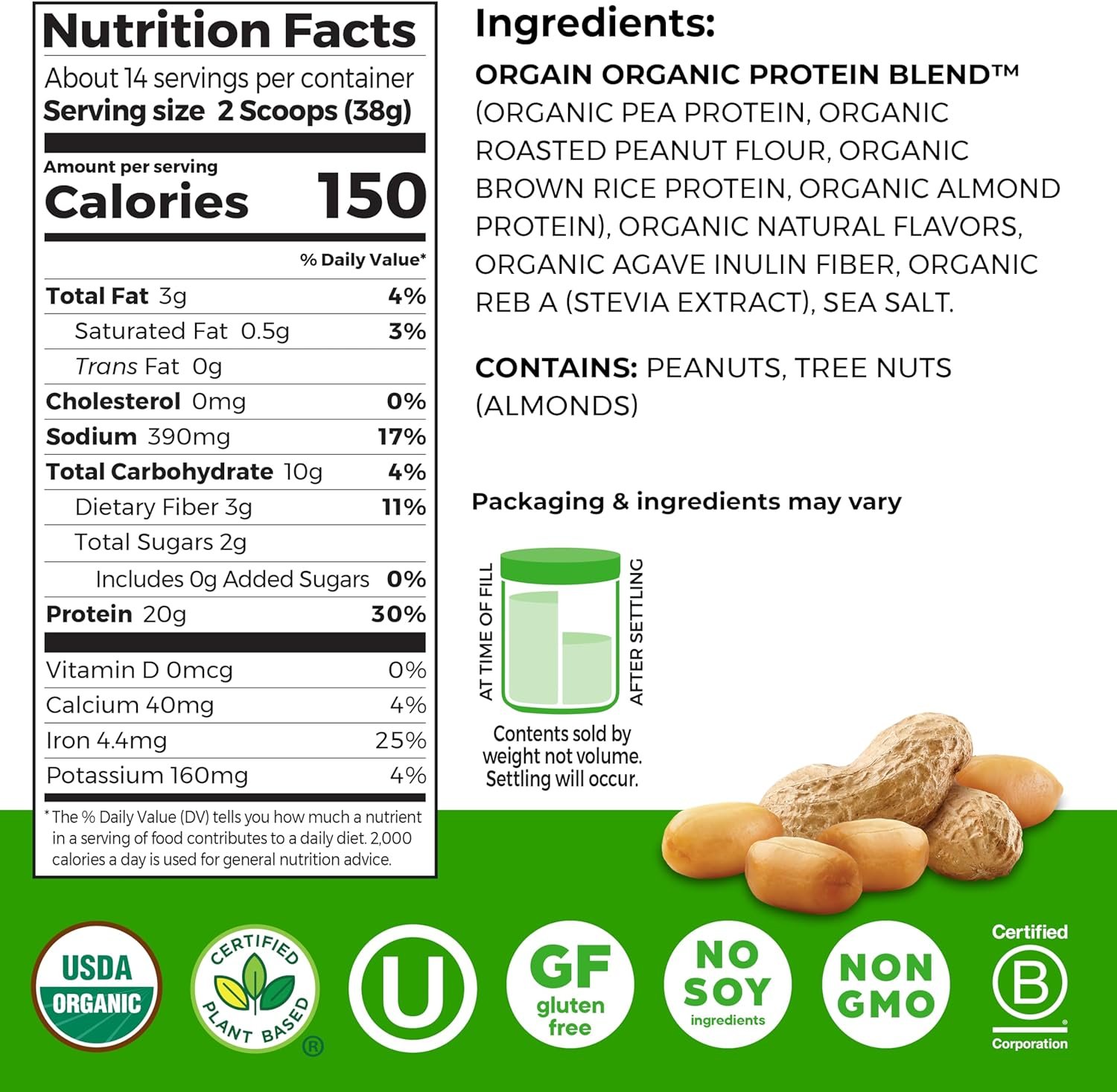 CLEANER INGREDIENTS: 20g of organic plant protein and 1-2g of sugar per serving. Our protein blend consists of organic peas, peanut flour, brown rice, and almond protein to provide a complete protein with all nine essential amino acids.