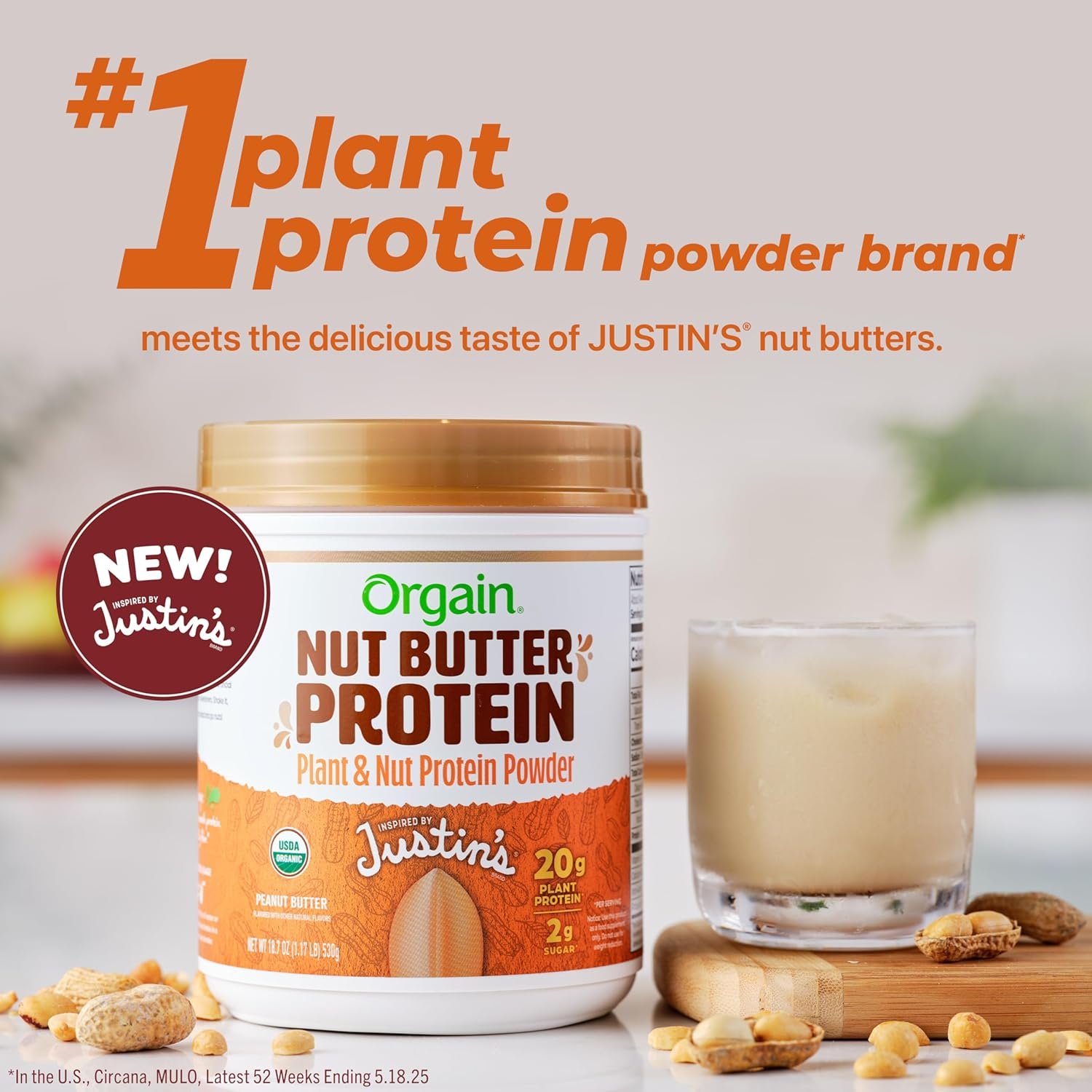 Love adding peanut butter in everything like smoothies, muffins, and spoons that go directly from the jar to your mouth? Join the club. We even went so far as to put it into our newest protein powder. Meet Orgain Nut Butter Protein, inspired by the delicious taste of JUSTIN’S® nut butters. The makers of JUSTIN’S® products know a thing or two about nut butters—that’s why we loaded our plant-protein with the flavor of their rich, dry-roasted classic peanut butter. It’s smooth, it’s savory, it’s slightly sweet, it means one less thing to put in your blender (but definitely something to put in your mouth). It has 20g of protein*, 3g of fiber*, and it’s nuttier than a peanut gallery. No dairy, no soy, no gluten, no GMOs—just a jar load of rich, creamy, peanut buttery awesomeness. Mixes so well, we dare you to try it with just water. So, scoop it, shake it, bake it—just go nuts with Orgain and JUSTIN’S®products.