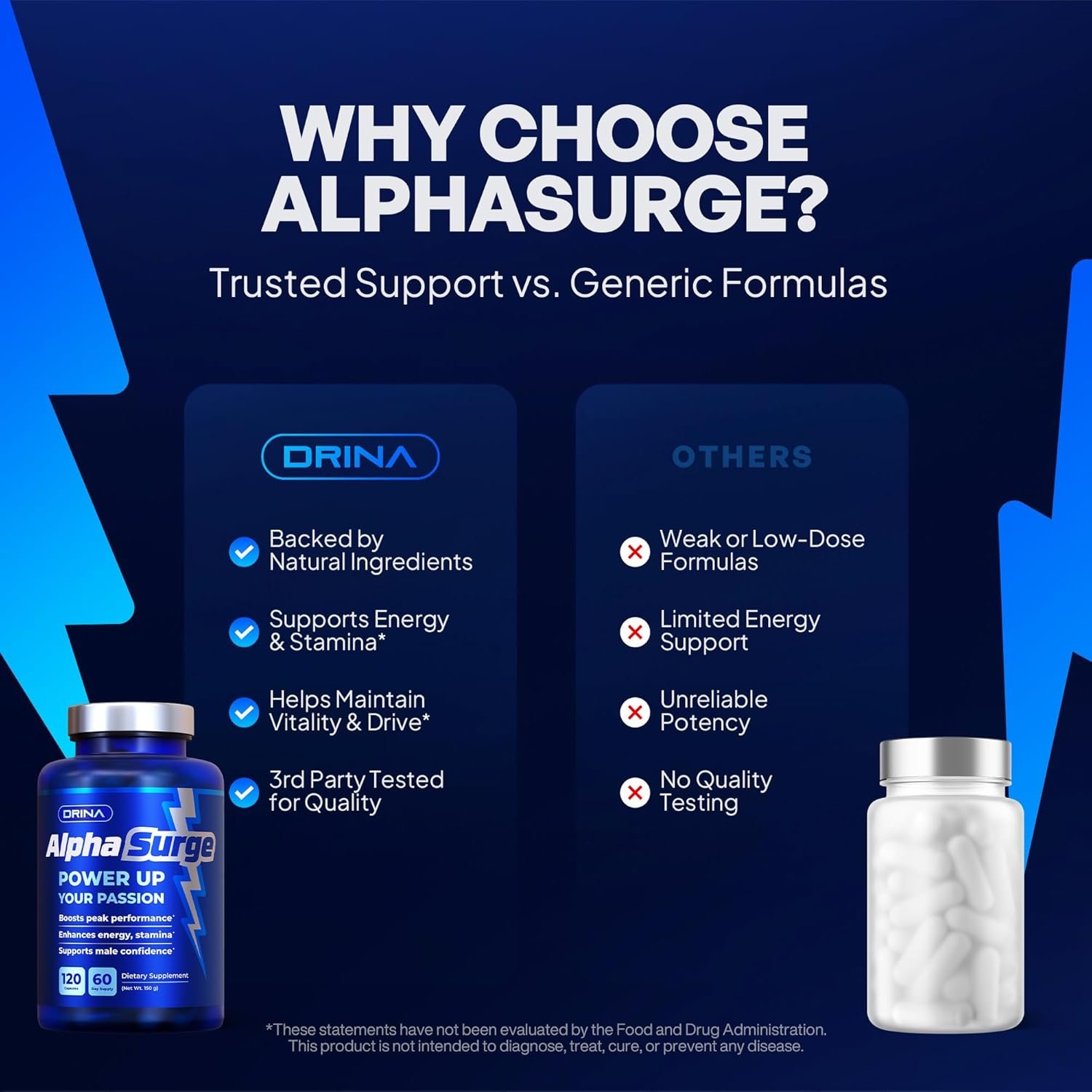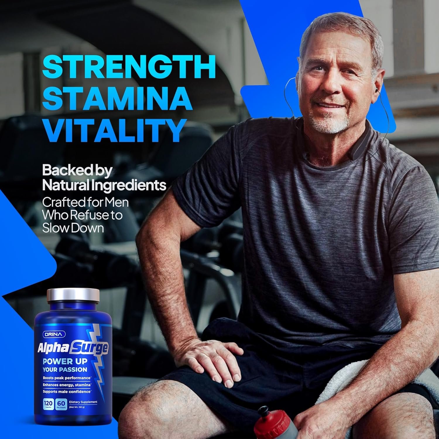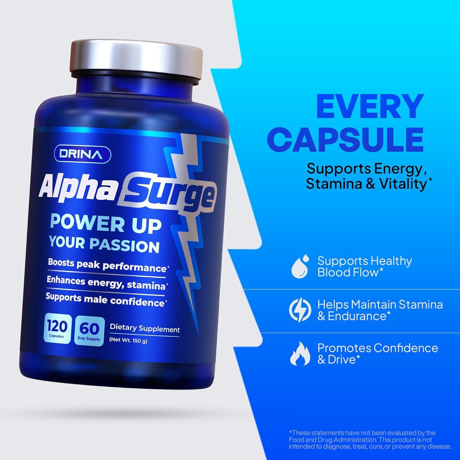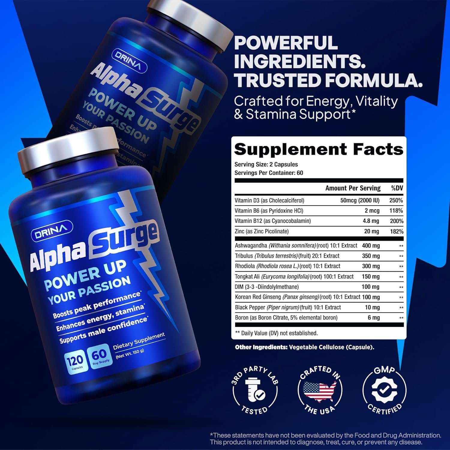 Discover AlphaSurge, a premium dietary supplement crafted to support men’s natural vitality and performance. Formulated with a potent blend of natural ingredients, AlphaSurge promotes healthy blood flow, sharpens mental focus, and sustains physical stamina for those moments that matter most. Each serving delivers targeted support to help you feel confident and energized, naturally. Manufactured in the USA in a GMP-certified facility, our non-GMO, gluten-free formula ensures quality and purity. Take two capsules daily to unlock your peak wellness and embrace your best self. Elevate your daily routine with Alpha Surge and experience the difference.