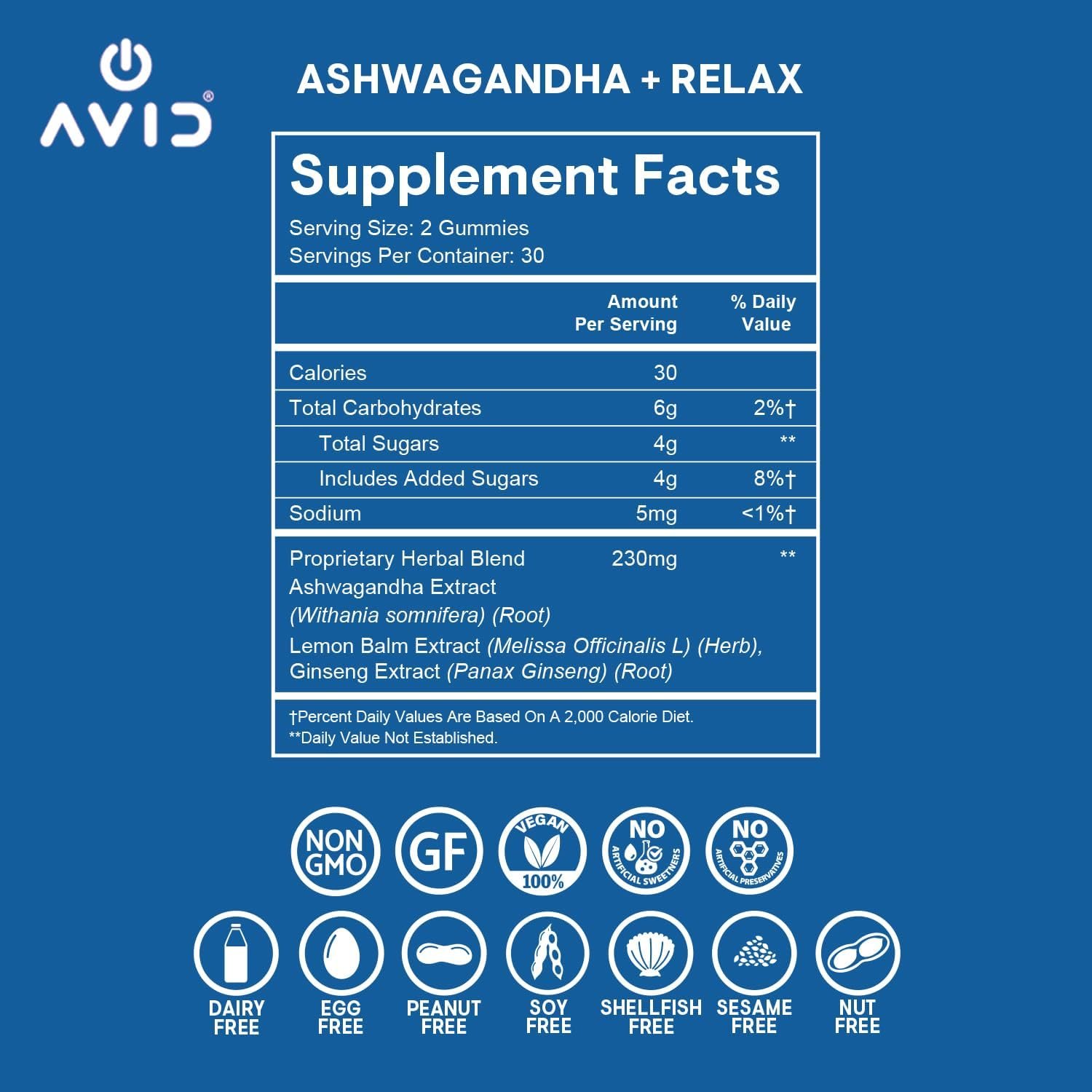 Proprietary Herbal Blend: 230mg (Ashwagandha Extract, Lemon Balm Extract, Ginseng Extract)