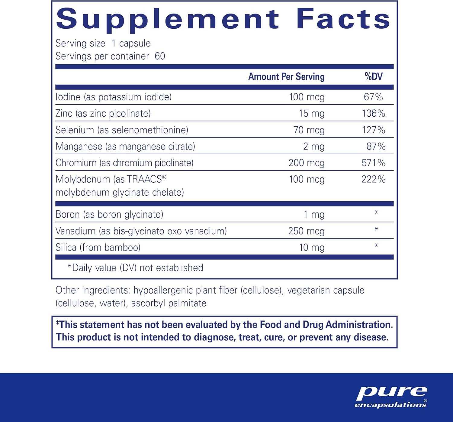 Essential Minerals: Pure Encapsulations Trace Minerals delivers a balanced combination of iodine, zinc, selenium, manganese, chromium, molybdenum, boron, and vanadium for wellness and DNA support*