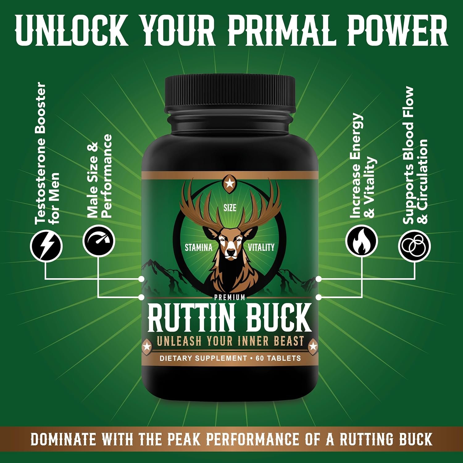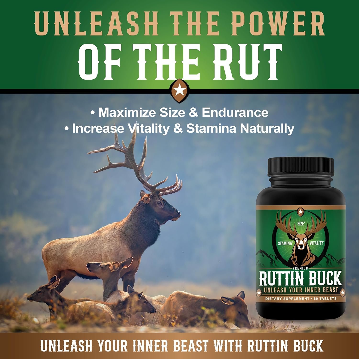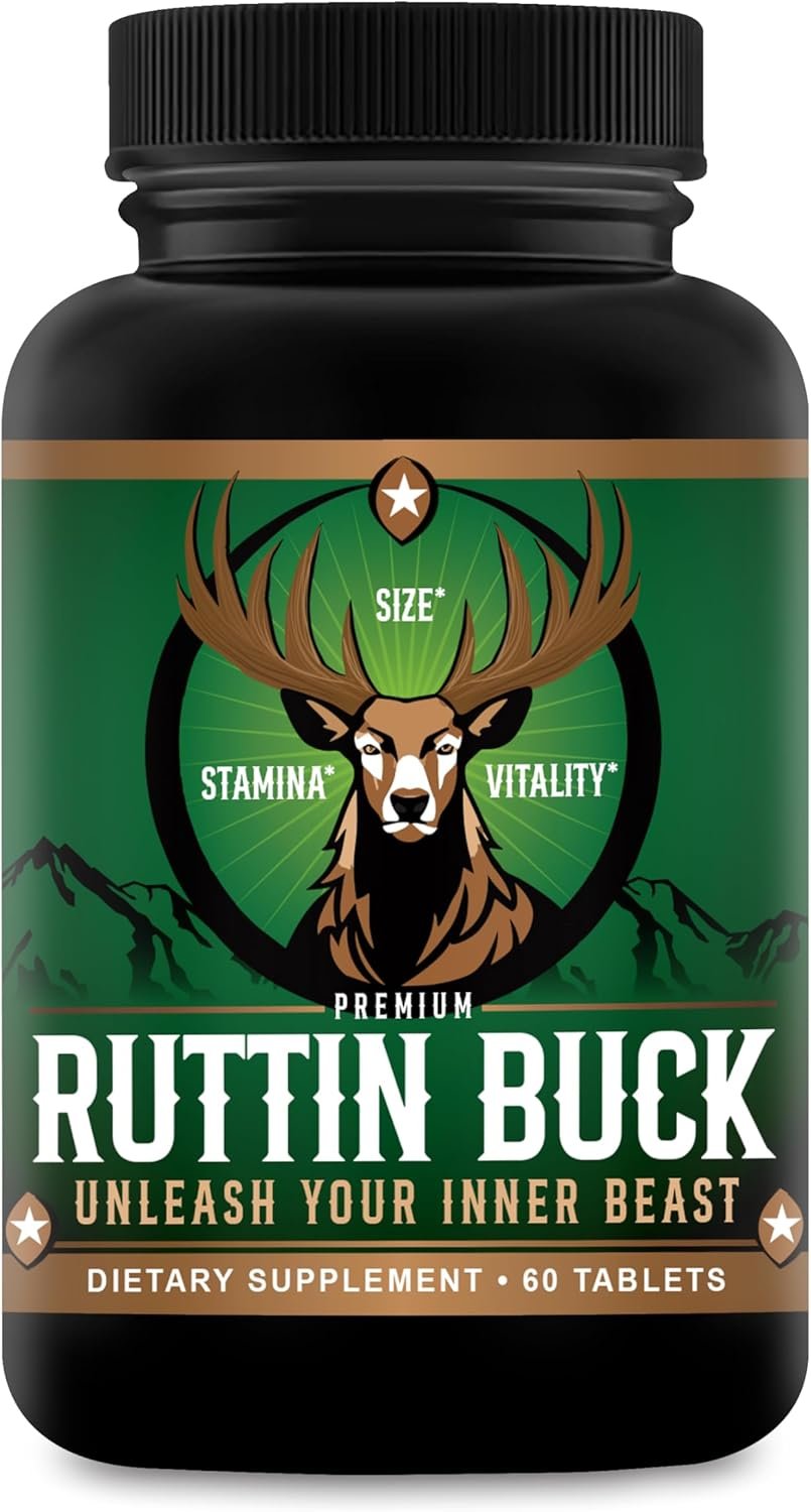 Unleash Your Inner Beast with Ruttin Buck! Inspired by the primal energy of a buck in rut, Ruttin Buck is the ultimate male performance formula designed to boost male SIZE, stamina, mood and performance. Helps fuel male growth and performance while aiding in recovery time. Each tablet delivers a potent blend of herbs, adaptogens, and amino acids to support size, strength, endurance, and peak male vitality. Feel Alpha, Perform Alpha. Experience the SIZE, confidence, endurance, and peak performance of a true rutting buck and unleash your primal power! Ships in white or black bottle