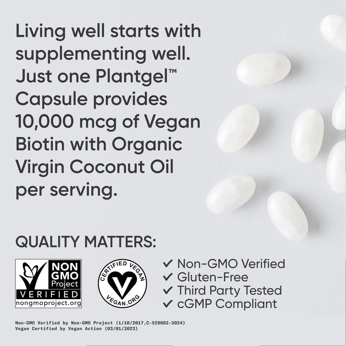 VEGAN CERTIFIED: Our biotin is Vegan Certified and encapsulated in the world’s only non-GMO verified, bovine, and carrageenan-free, Plantgel capsule. It’s filler-free, formulated with organic coconut oil, and Manufactured in the USA in cGMP-compliant facilities