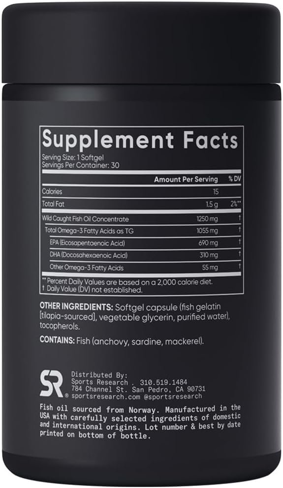 Triple Strength▴ 1250 mg Fish Oil | 1055 mg Omega-3 Supports Brain & Heart Health Gluten-Free Wild Caught Dietary Supplement Igen Non GMO Tested IFOS Third Party Tested cGMP Compliant Friend of The Sea Certified by FOS-Wild Non BPA Quality Matters Omega-3 is a type of fatty acid that’s essential for your body to function properly. Omega-3 is great for heart health, brain health, and immune health. But here’s the thing: there are many fish in the sea, but there’s only one triple strength Omega 3 from Sports Research for adults. 3x the EPA / DHA in one softgel. What if we told you that some fish oil brands sell a lower quality of their fish oil to justify you taking 2 or 3 pills a day, instead of one? It’s true. Then what if we told you we pack an ultra-concentrated dose that delivers 3x the amount of EPA and DHA in one softgel? Guess what? Also true! ▴ Triple Strength Omega-3 (in Triglyceride Form [TG as rTG]) when compared to standard fish oil softgels with only 10-30% Omega-3 content.