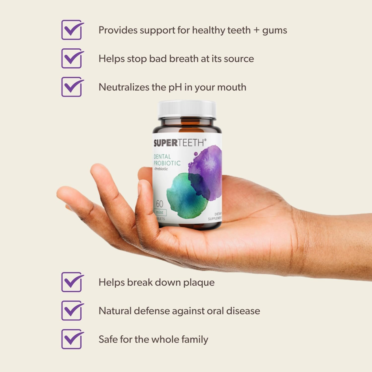 PROBIOTICS FOR FRESH BREATH : Bad breath is not just about masking the odor; it’s about addressing its root causes. SuperTeeth Dental Probiotic uses beneficial bacteria to naturally balance your oral ecosystem, ensuring that your breath remains fresh and pleasant consistently. Of course it provides a minty sensation after every use, leaving your mouth feeling invigorated and exceptionally clean. This refreshing feeling ensures that you start or end your day with a burst of freshness.