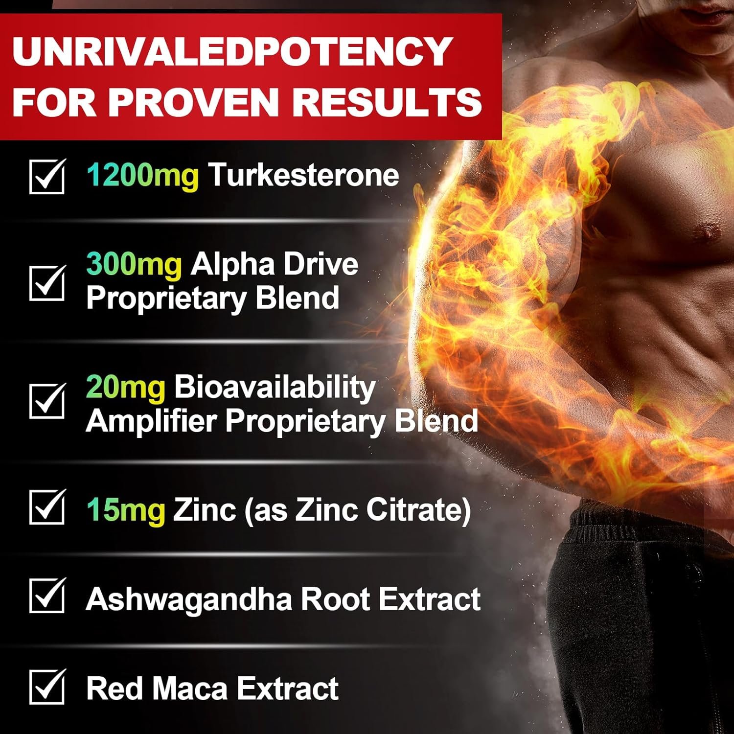 Nature’s Performance Igniter: This testosterone booster for men combines turkesterone, zinc and maca root to increase stamina and sexual vitality. Its unique alkaloids enhance androgens and naturally boost testosterone levels. With Ashwagandha’s stress-relieving power, you’ll recover quicker, train harder, and feel more driven—in and out of the gym