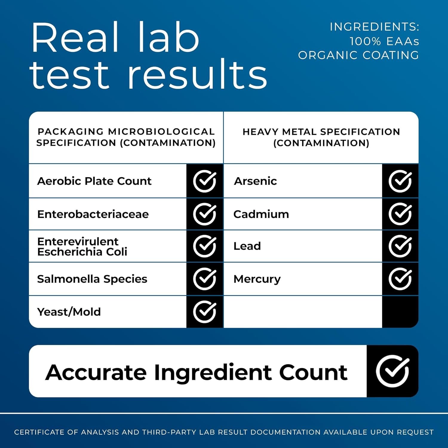 𝗩𝗘𝗚𝗔𝗡 & 𝗡𝗢𝗡-𝗚𝗠𝗢 𝘄𝗶𝘁𝗵 𝗡𝗢 𝗕𝗜𝗡𝗗𝗘𝗥𝗦 𝗼𝗿 𝗙𝗜𝗟𝗟𝗘𝗥𝗦: With absolutely no animal products, GMOs, binders or fillers, we ensure that our pure EAAs are packed with all the good stuff you want without any of the junk. Ultimate Essential Amino Acids are crafted to be pure amino acids without anything else except a certified organic coating for better, hassle free swallowing and digestion.