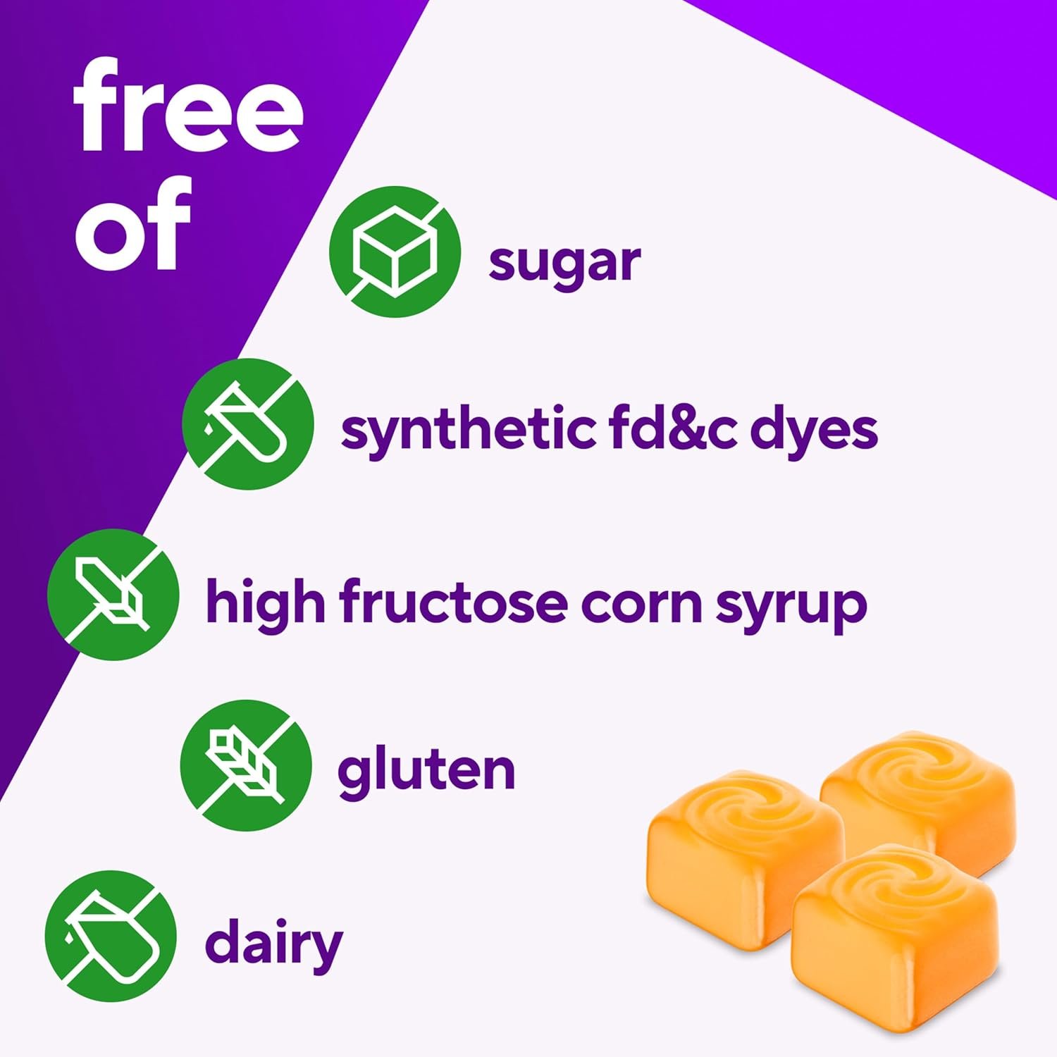 Sugar Free. No gluten, no high-fructose corn syrup, no dairy, and no synthetic FD&C dyes.