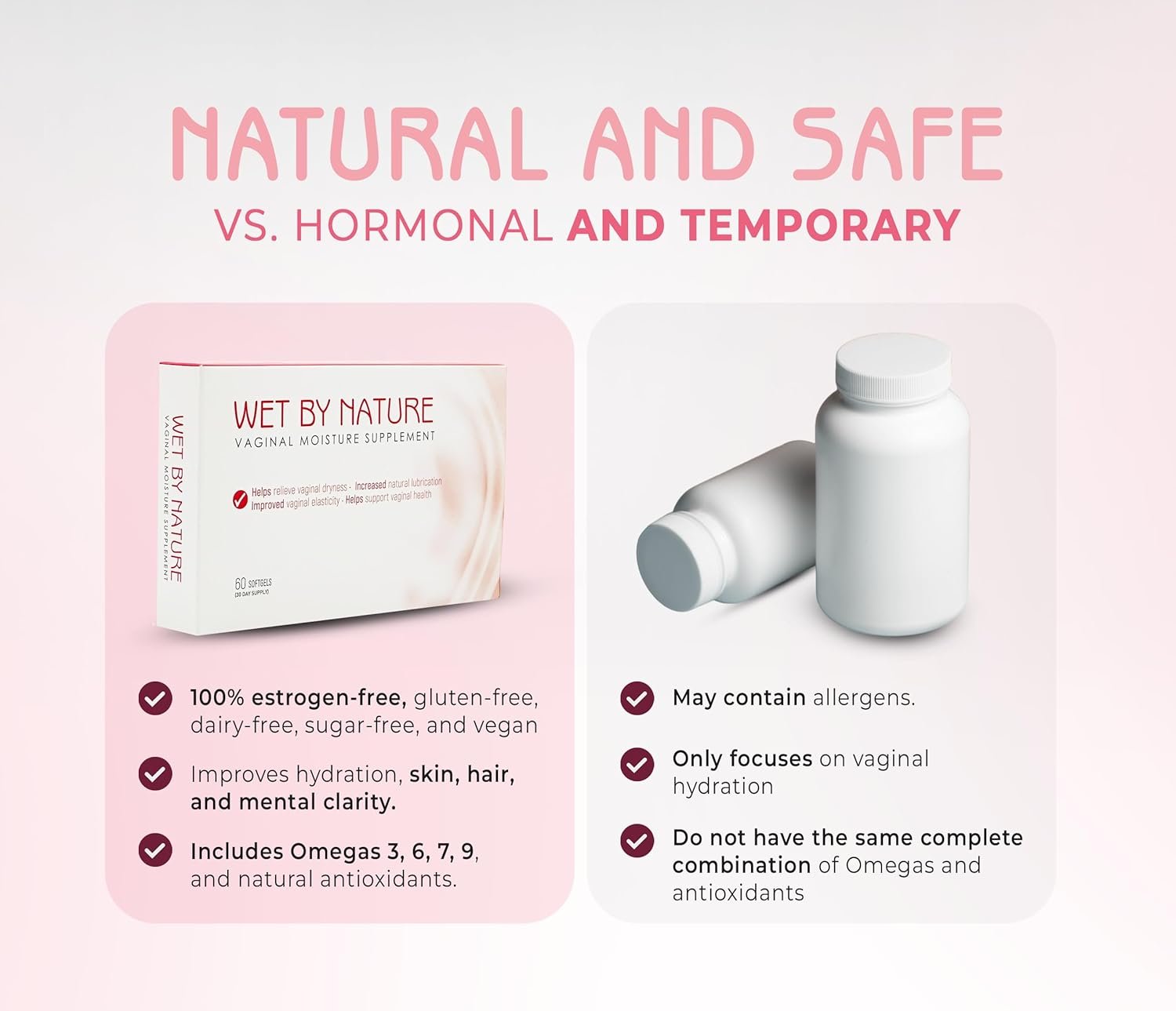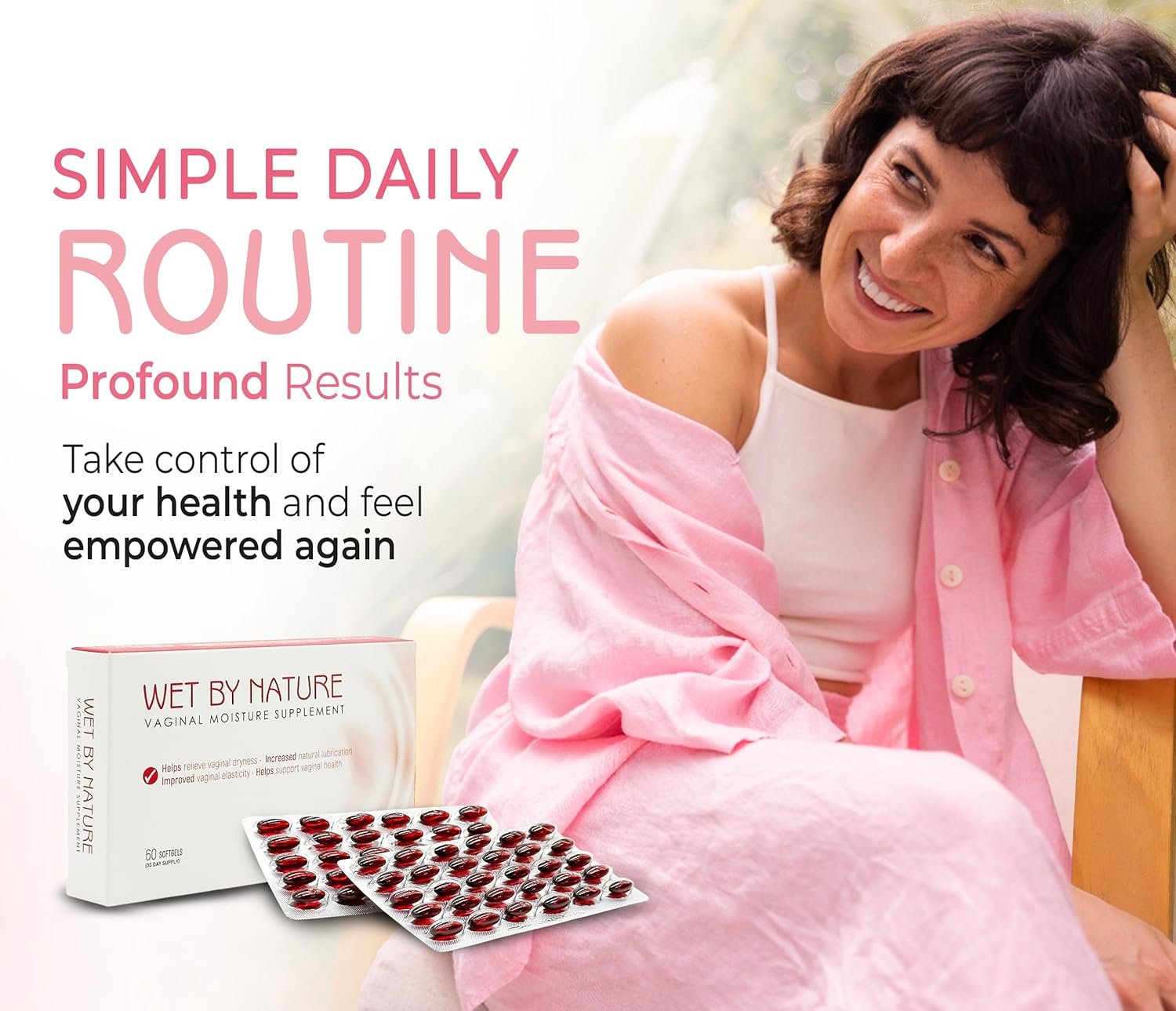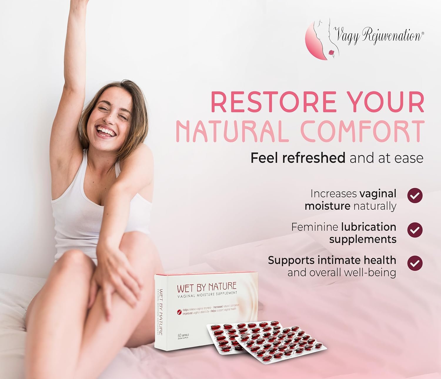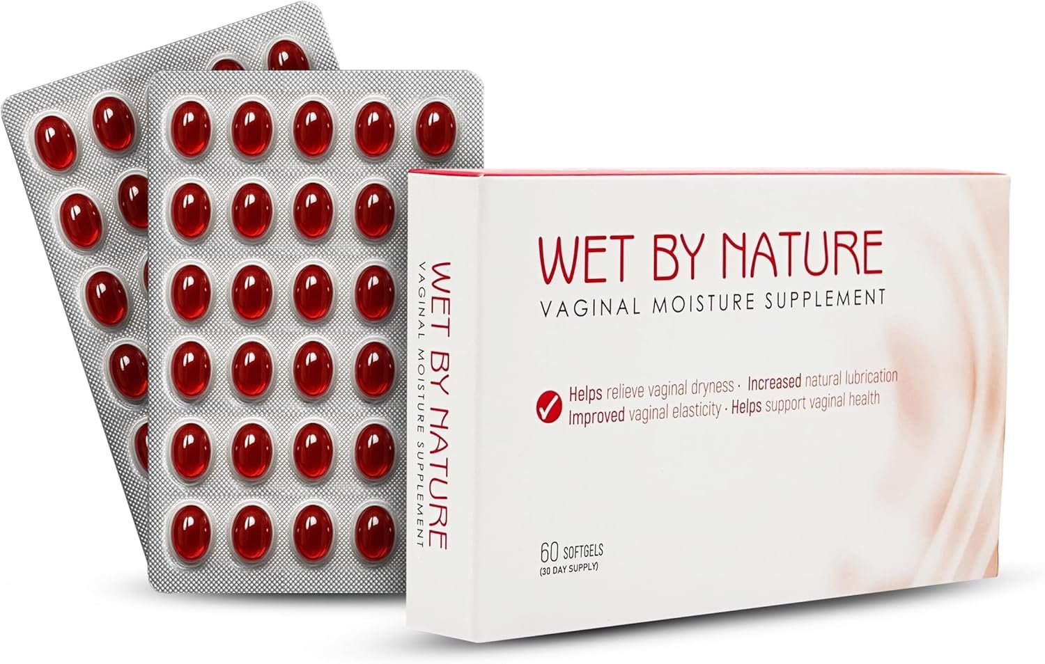 Package Includes: Each order of Wet by Nature from Vagy Rejuvenation comes with 60 soft-gels, a 30-day supply of estrogen-free female dryness supplements designed for daily use to help restore natural lubrication and support your health.